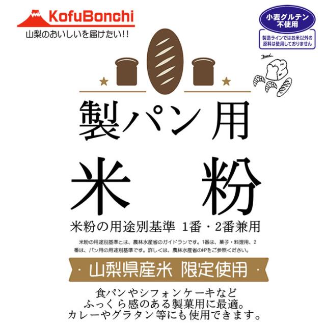 製パン用にさらに最高品質を追求した米粉です。良く膨らみ、ケーピングの少ない品種を原料としております。山梨県産うるち米を100%使用しています。パンの歩留まりが高い。米粉パンをつくるベーカリーショップより評価をいただいております。ホームべカリーで3回分となります。小麦粉の代用として、カレーや天ぷら粉等にも使用できます。製パン用米粉 900g 新ガイドライン基準適合(山梨県産米使用)■用途 パン等 ■原材料 うるち米(山梨県産)■賞味期限 製造日より1年 ■内容量 900g