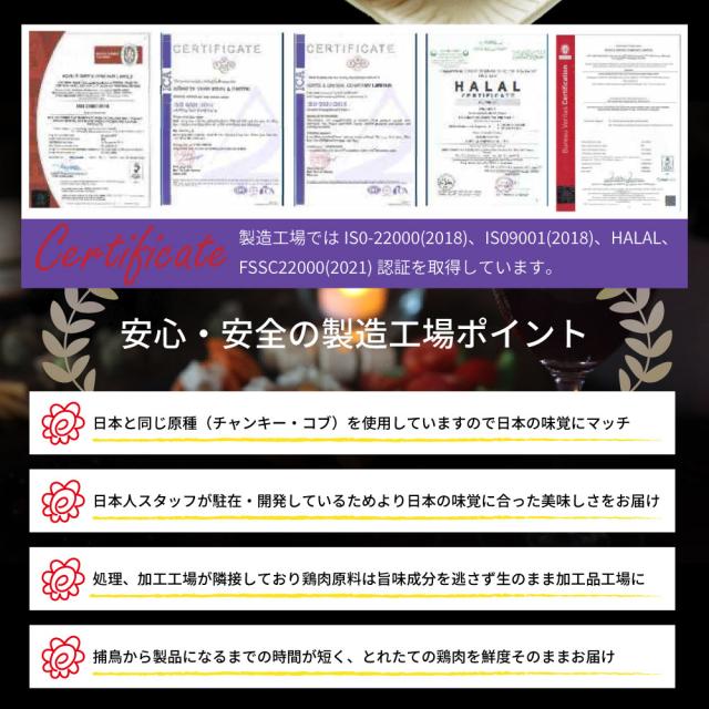 原材料:鶏肉(もも肉)、植物油脂(大豆含む)、小麦粉、でん粉、食塩、卵白粉(卵を含む)、香辛料、しょうゆ、料理酒、粉末しょうゆ、砂糖、脱脂粉乳、ぶどう糖/加工デンプン、調味料(アミノ酸)、ポリリン酸Na、乳化剤、酸味料
