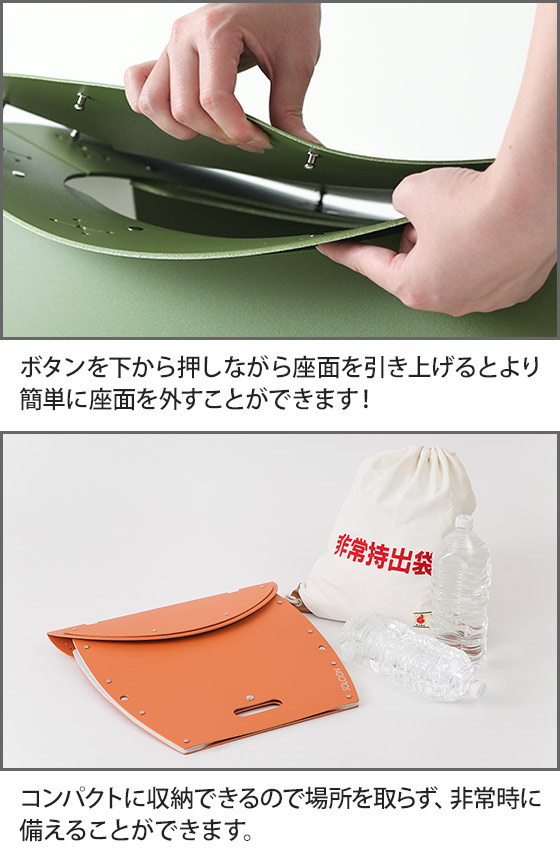 また、座面を外しても座れる程の強度があるので、非常時の簡易トイレとしても使用できます。