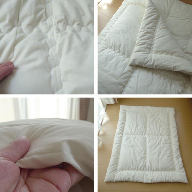 - 保育園のお昼寝布団用に購入しました。 掛け布団は薄型のを選びました。 元々使っているポリエステルの掛け布団と比べて、重みがあります。 敷布団はとても厚みがあって、子供を寝かすと包まれるように沈んでいて気持ちよさそうです。 最近はお昼寝しても1時間もしないで起きるのに この布団で寝かせるといつもより長く寝ます。 この値段でとても良い買い物ができました。 発送も早く、翌々日には届きました。 カバーも同時購入しましたが、 布団側とカバー側ともに、留める紐やボタンなどが付いていないタイプで ズレていきそうな点が唯一気になりました。