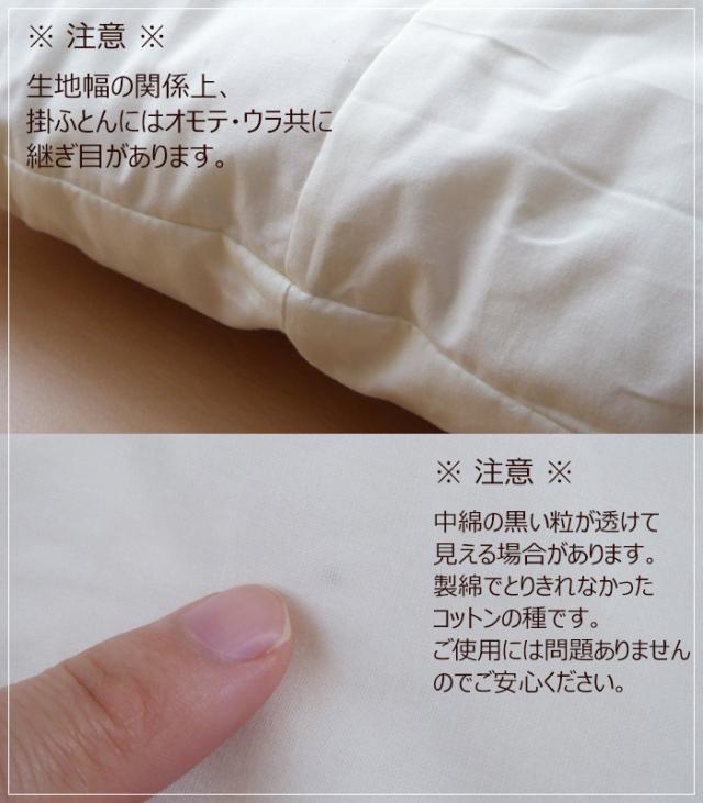 | ・新生児の方がお使いの場合はうつぶせ寝はお避け下さい。 ・木綿わた特有のにおいがあります。天日に干すとにおいは薄くなります。 ・洗濯はクリーニング店か寝具専門店にご相談ください。ご家庭で洗うと中綿の片寄りの原因になります。 ・生地幅の関係上、掛ふとんには表裏共に継ぎ目(つぎめ)があります。 |