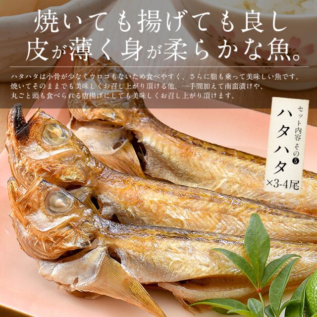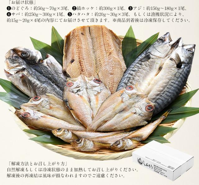 5種(ノドグロ:約50〜70g×3尾、縞ホッケ:約300g×1尾、あじ:約150g〜180g×1尾、さば:約250g〜300g×1尾、はたはた:約20g〜30g×3尾、もしくは漁獲状況により約15g〜20g×4尾)