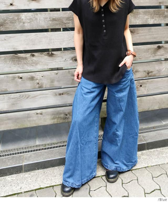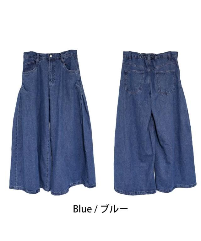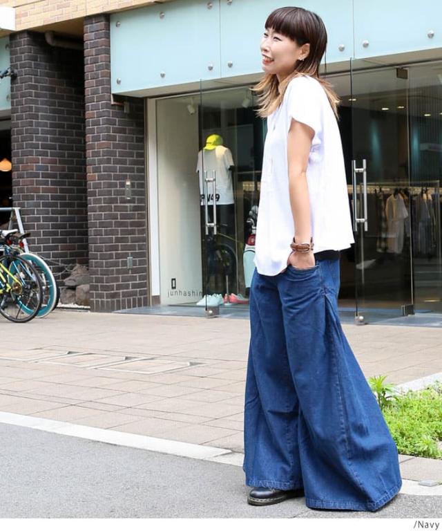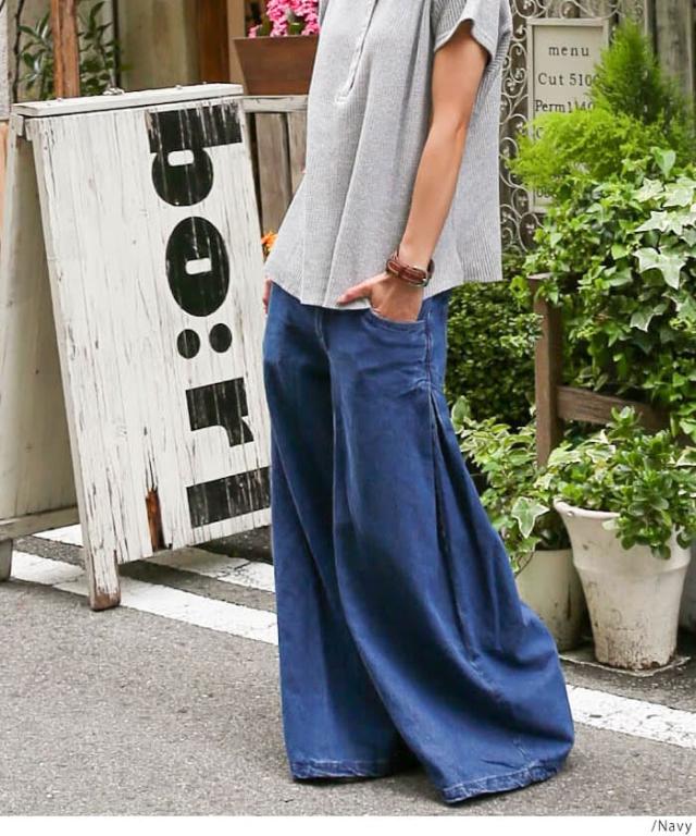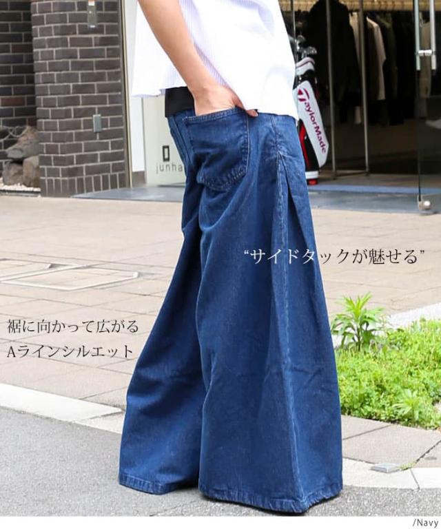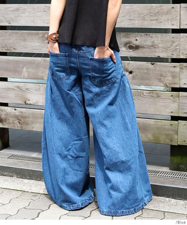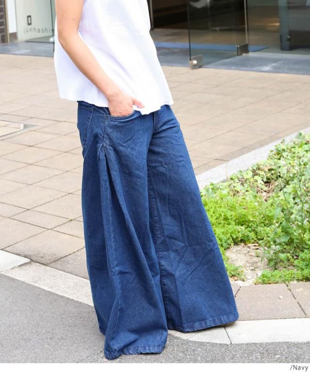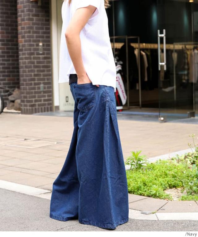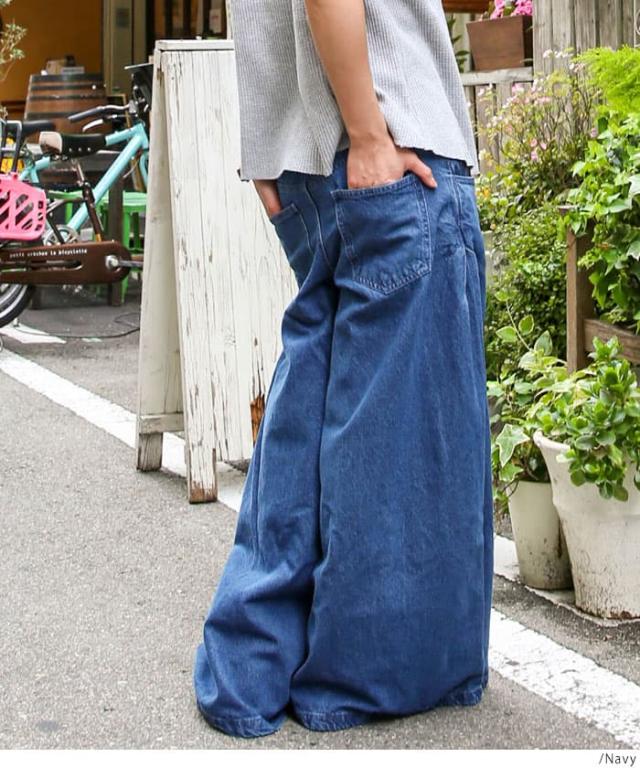 穿くだけで最旬スタイルが完成!!サイドにタックの入ったロング丈デニムワイドパンツ。 フレア感のあるデザインが可愛く、ワイドシルエットで美脚効果も。脚のラインを拾わない、体型カバーをしてくれる立体的シルエットが嬉しいポイント。しっかりしたちょうど良い厚みの綿100%素材のデニムで、バックウエストにはゴムが入っていて、楽ちんなは着心地。カラーは、ベーシックなネイビーとブルーをご用意しました。オールシーズン着回せるヘビロテデニムパンツです!!