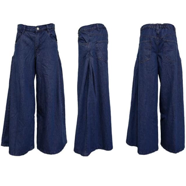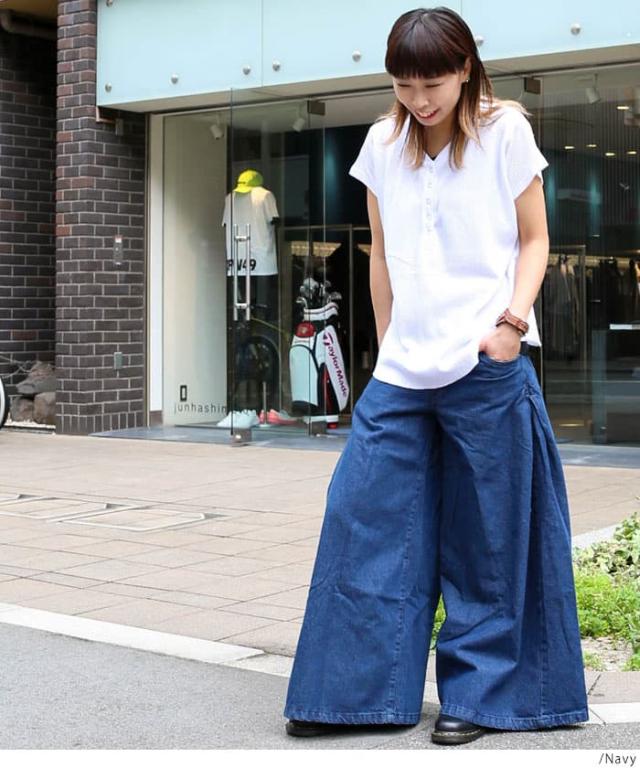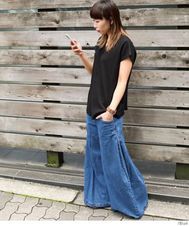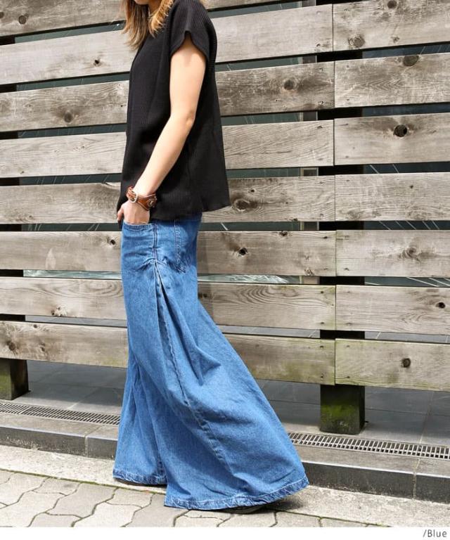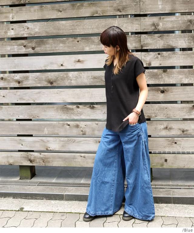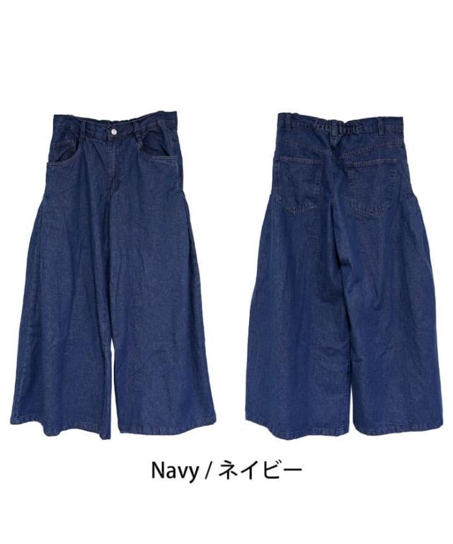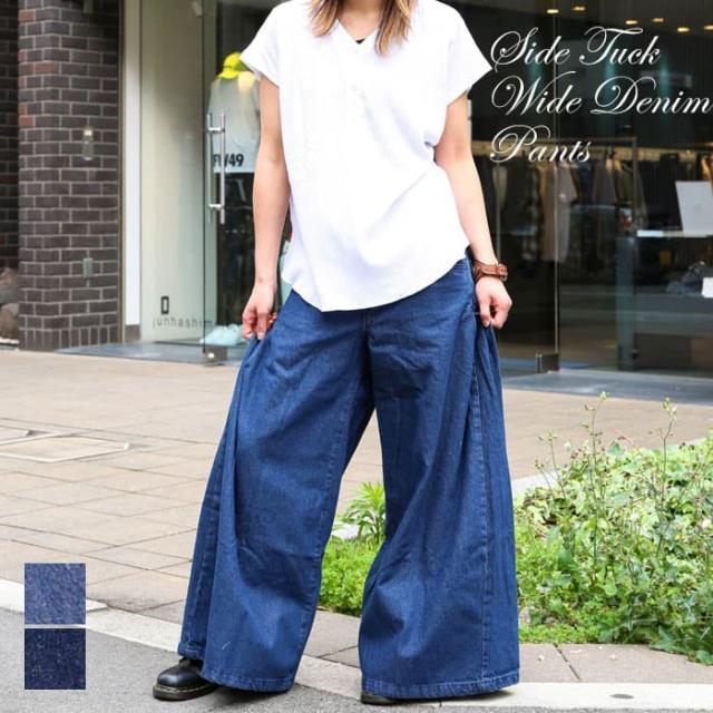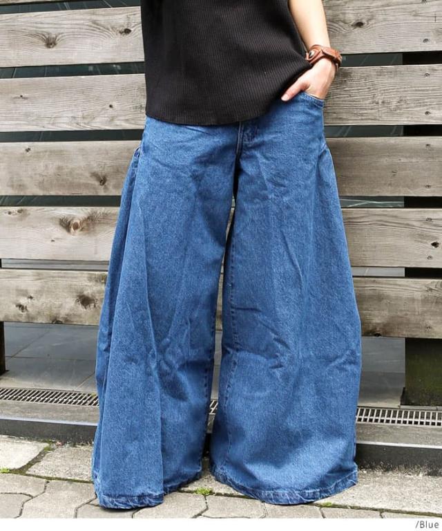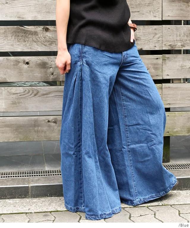 穿くだけで最旬スタイルが完成!!サイドにタックの入ったロング丈デニムワイドパンツ。 フレア感のあるデザインが可愛く、ワイドシルエットで美脚効果も。脚のラインを拾わない、体型カバーをしてくれる立体的シルエットが嬉しいポイント。しっかりしたちょうど良い厚みの綿100%素材のデニムで、バックウエストにはゴムが入っていて、楽ちんなは着心地。カラーは、ベーシックなネイビーとブルーをご用意しました。オールシーズン着回せるヘビロテデニムパンツです!!