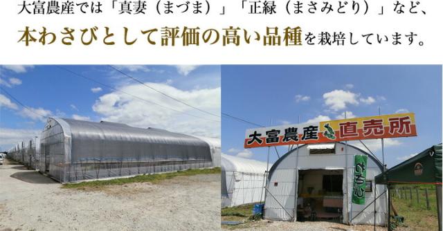 最近は、健康にもいいと注目のわさび。お刺身、お蕎麦におろしたてのわさびをちょっとのせて食べると、甘みのあるわさびの風味の中、ツンとくる刺激がたまりません!温暖な地域やハウス栽培の物は、見た目は奇麗ですが味は水っぽく辛味も少ないものになりますが、本商品は伏流水の自然の中で育っているので、身の引き締まったもので風味の辛味も違います。都会では、まず手に入ることのない山形県東根産、わさび農家「大富農産」の本わさびをお試しください!