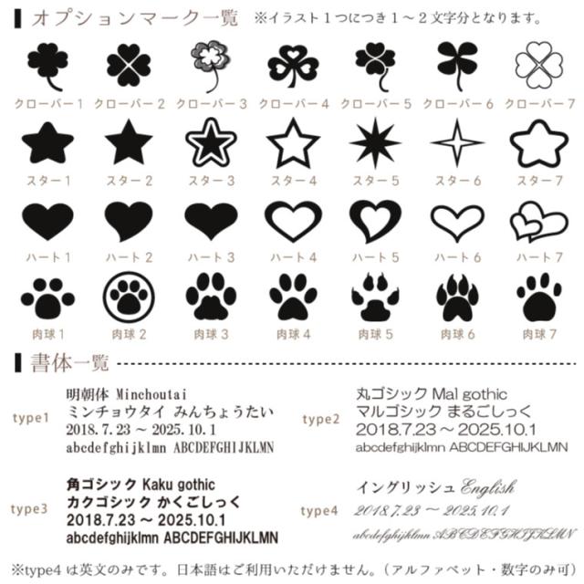 刻印内容:1.お名前 2.生誕日〜没年月日(例 1942.3.3-2010.2.22) 3.メッセージ(12文字程度まで)(イラストは番号でご指示ください)