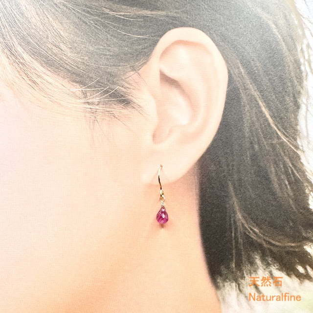 こちらは、天然石ルビーのブリオレットカットにK14gfフックの金具を合わせました。アレルギー対応の金具へも変更できます。