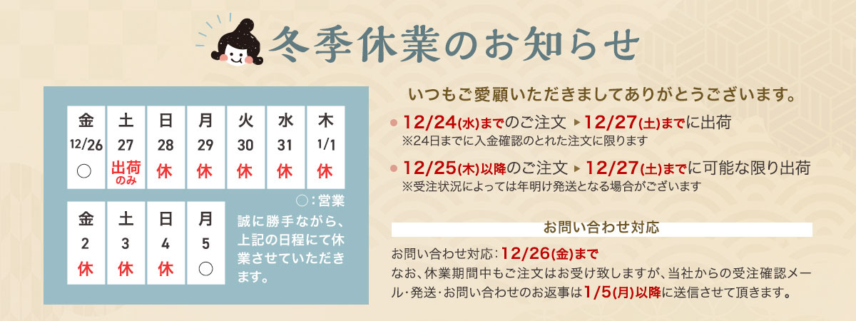 【お知らせ】年末年始は12月27日(土)〜1月4日(日)までお休みです。