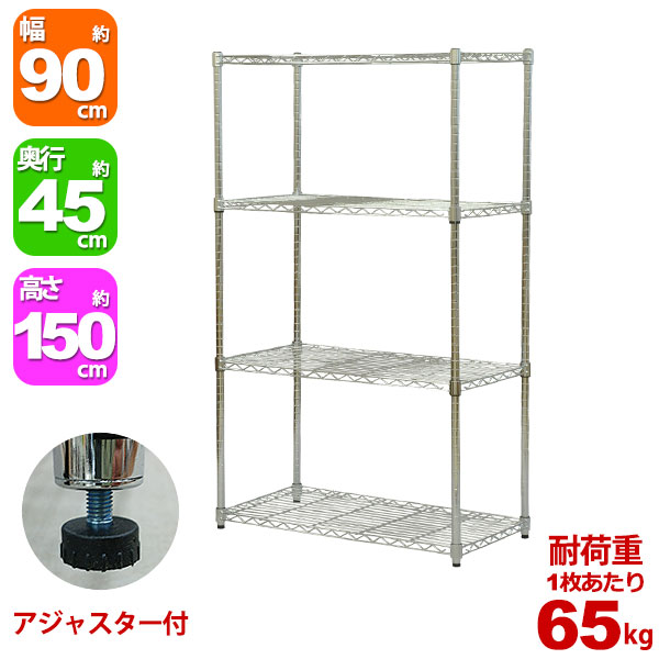 スチールラック 幅90cm 奥行き45cm 高さ150cm 4段 メッキ ガレージ収納 タイヤ 工具 灯油缶 整理棚 リビング収納 パントリー収納 倉庫 物置 収納 衣類収納 オーディオ AV機器 ウォークインクローゼット 可動棚 アジャスター YSR-9015