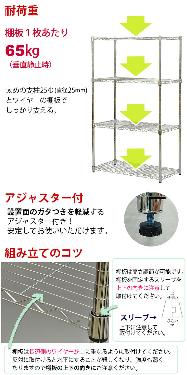 太めの支柱25Φ(直径25mm)とワイヤーの棚板でしっかり支える耐荷重