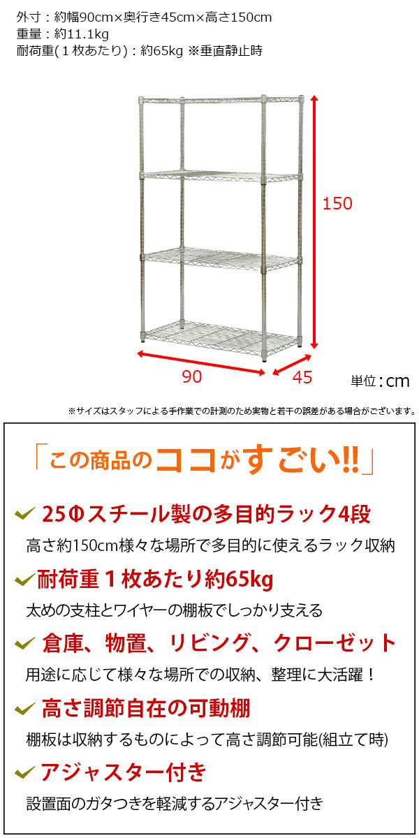 スチールラック 幅90cm 奥行き45cm 高さ150cm 4段 の説明