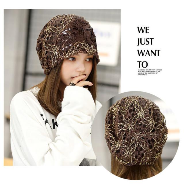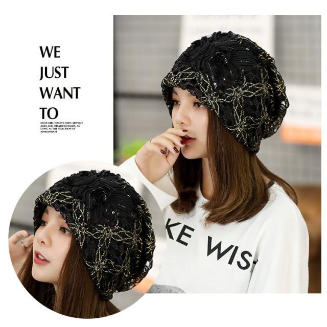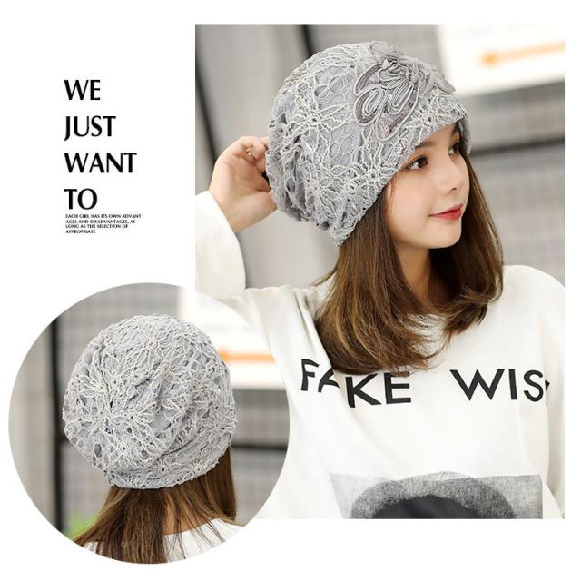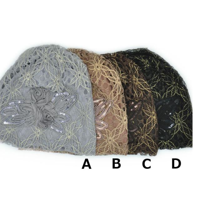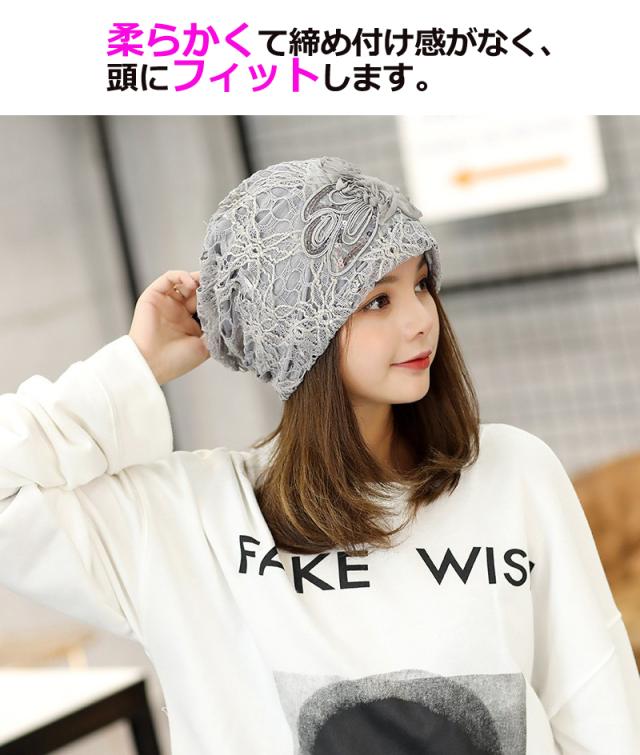美しいレースの透かし編みが上品さもあり、頭に柔らかくフィットします。