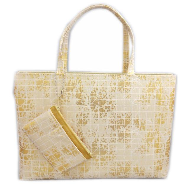 バッグ 手提げ ポーチ セット 織地 金糸入り 薄金地格子 横型 日本製 着物 お稽古事 女性用