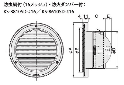 屋外換気口 ステンレス 薄型グリルタイプ 防火ダンパー付 【 用途 】 換気有効面積 (平方センチメートル):69 【 仕様 】適用パイプ スパイラル管 内径直径150 防火ダンパー バイメタル式 :72度 【 仕上 】 本体:アクリル焼付塗装 色: メタリックライトグレー 【 材質 】 本体:ステンレス (SUS304) t=0.5mm ダンパー部:ステンレス t=1.5mm 【 サイズ 】寸法 A 191 B 166.5 C 50 D 147 E 42 【 品番 】KS-8610SD-#16 【 備考 】 注)局所換気扇へのご使用はおやめください。 防火ダンパーを密閉または半密閉の燃焼設備(給湯器、ふろ釜等)の排気ダクト等に使用すると、誤作動によりダンパーが閉じて不完全燃焼等、危険な場合がありますので使用しないでください。 ※画像はイメージです。 ※パッケージ、仕様、品番などの変更が予告なく変更される場合が御座います。 |