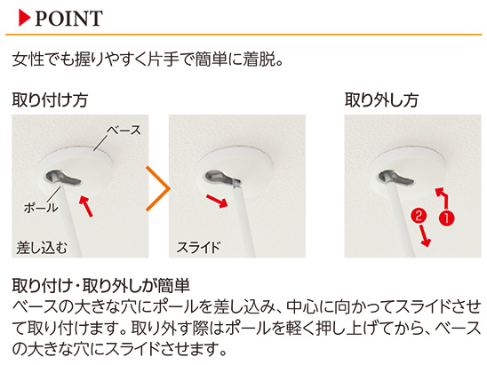 AirHoop エアフープ 天井取付タイプ KS-NRP020 シリーズ 【 特長 】 ●シンプルなデザインの屋内物干。 ●設置スペースは少なく、使わない時は簡単に外せます。 ●屋外での物干しが気になる場合や、夜干しのライフスタイルにおすすめ。観葉植物を吊り下げたり、天井空間を演出するアイテムとしても活躍します。 ●ポールM2本同梱 ●取り付け・取り外しが簡単 ベースの穴にポールを差し込み 中心に向かってスライドさせて取り付けます(。取り外しは逆の動作) ●リング部内側には滑りにくいゴム系素材 を採用。 ●ベースの厚みはわずか1.3cm。デザイン性 にも優れ、天井に取り付けてもスッキリ。 【 耐荷重 】8kg(1本当り) 【 カラー 】ホワイト×グレー 【 仕様 】2本入 【 仕上 】 ベース・ポールヘッド:サチライト クロム めっき仕上 ポール:アクリル 焼付塗装 【 材質 】 ベース:ベース本体: 亜鉛ダイカスト ベースカバー: PP樹脂 ポール:ポールヘッド: SUS303 ポール: アルミニウム フープ:PP樹脂・ エラストマ 【 重量 】M:170g 【 品番 】KS-NRP020-MM-WGR 【 備考 】 ●取り付け・取り外しが簡単 ベースの穴にポールを差し込み 中心に向かってスライドさせて取り付けます。(取り外しは逆の動作) セット内容 KS-NRP020-MM(Mサイズ2本セット) ●ベース ………………………………………………2個 ●ベースカバー ………………………………………2個 ●ポールヘッド ………………………………………2本 ●ポールM ……………………………………………2本 ●フープ ………………………………………………2本 ● バインドタッピンねじ(ユニクロ)呼び4×50 …4本 危険ですのでフープや竿にぶら下がらないでください。本製品は屋外では使用しないでください。下地は屋内物干の耐荷重に十分耐えられるようにしてください。傾斜した天井には取り付けな いでください。ロープは掛けないでください。 ※画像はイメージです。 ※パッケージ、仕様、品番などの変更が予告なく変更される場合が御座います。 |
