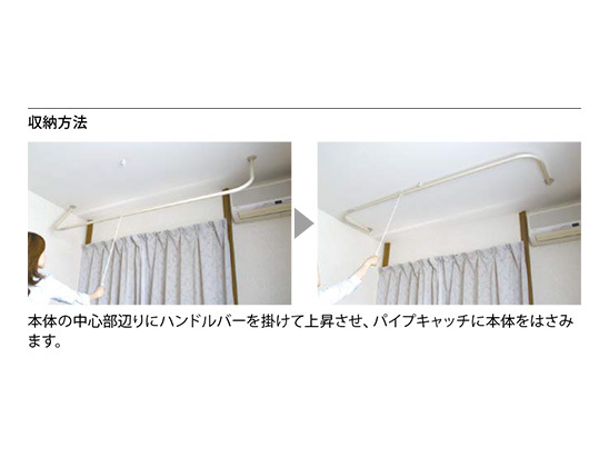 収納方法:本体の中心部辺りにハンドルバーを掛けて上昇させ、パイプキャッチに本体をはさみます。