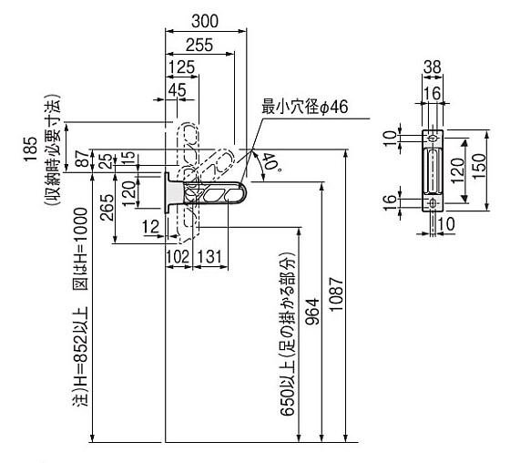 注)ブラケットを取り付ける際は手摺乗り越え危険防止のため H=852以上の位置にくるように取り付けてください。