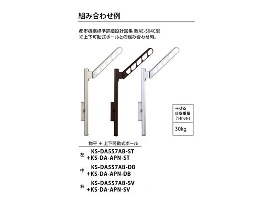 屋外物干 KS-DA557AB シリーズ 【 特長 】 ●垂直収納でベランダをすっきりと演出。 ●上下可動式ポールと組み合わせてお使いいただけます。 ●アームは水平(90度)、斜め上(40度)、垂直収納ができます。 【 干せる目安重量〔1セット〕 】30kg 【 カラー 】ダークブロンズ 【 仕上 】 アクリル 焼付塗装 【 材質 】 アルミダイカスト (ADC12) 【 サイズ 】L550mm 【 重量 】0.8kg 【 品番 】KS-DA557AB-DB 【 備考 】 2本入 注)ブラケットを取り付ける際は手摺乗り越え危険防止のため H=960以上の位置にくるように取り付けてください。 屋外物干の耐荷重に十分に耐えられる壁面及び支柱に取り付けてください。また、避難経路を確保できる場所に取り付けてください。足掛かり位置から足のかかる部分までの高さが650mm以上に なるように設置してください。 【 取付パーツと使用数一覧 】別途必要なパーツです。 取付場所:取付パーツ( 1セット):使用数(セット) 手摺子取付 :D:2 壁面直付:F:1 支柱取付:E/G:2/1 バルコニー用:N:1 キャップ:P:1 リフォーム用:R2:1 RC直付 :L:1 丸支柱用 :S:1 ※画像はイメージです。 ※パッケージ、仕様、品番などの変更が予告なく変更される場合が御座います。 |