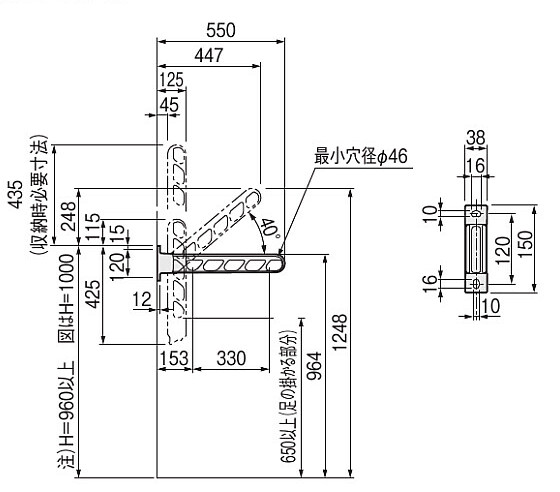 注)ブラケットを取り付ける際は手摺乗り越え危険防止のため H=960以上の位置にくるように取り付けてください。