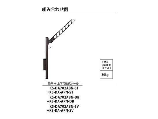 屋外物干 折りたたみ収納タイプ KS-DA702ABN シリーズ 【 特長 】 ●左右折りたたみ収納タイプ。 ●回転部・摺動部にポリアセタール樹脂を採用して耐久性・耐摩耗性に優れています。 ●上下可動式ポールと組み合わせてお使いいただけます。 【 干せる目安重量〔1セット〕 】30kg 【 カラー 】ステンカラー 【 仕上 】 アクリル 焼付塗装 【 材質 】 アルミダイカスト (ADC12) 【 サイズ 】L700mm 【 重量 】1.2kg 【 品番 】KS-DA702ABN-ST 【 備考 】 2本入 注)ブラケットを取り付ける際は手摺乗り越え危険防止のためH=865以上の位置にくるように取り付けてください。 屋外物干の耐荷重に十分に耐えられる壁面及び支柱に取り付けてください。また、避難経路を確保できる場所に取り付けてください。足掛かり位置から足のかかる部分までの高さが650mm以上に なるように設置してください。 【 取付パーツと使用数一覧 】別途必要なパーツです。 取付場所:取付パーツ( 1セット):使用数(セット) 手摺子取付 :D:2 壁面直付:F:1 支柱取付:G:1 バルコニー用:N:1 キャップ:P:1 リフォーム用:R2:1 RC直付 :L:1 丸支柱用 :S:1 ※画像はイメージです。 ※パッケージ、仕様、品番などの変更が予告なく変更される場合が御座います。 |