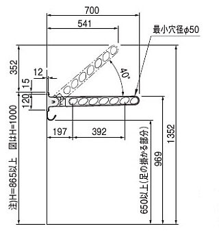 注)ブラケットを取り付ける際は手摺乗り越え危険防止のためH=865以上の位置にくるように取り付けてください。