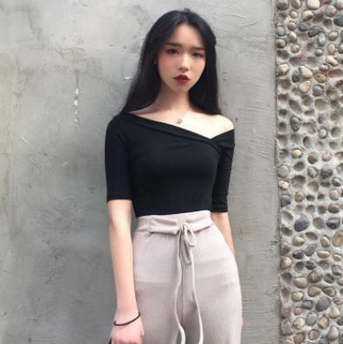 LAZA 【FREEサイズ ブラック】Vネック ストラップレスシャツ Tシャツ 半袖シャツ セクシー タイト デコルテ 可愛い お洒落