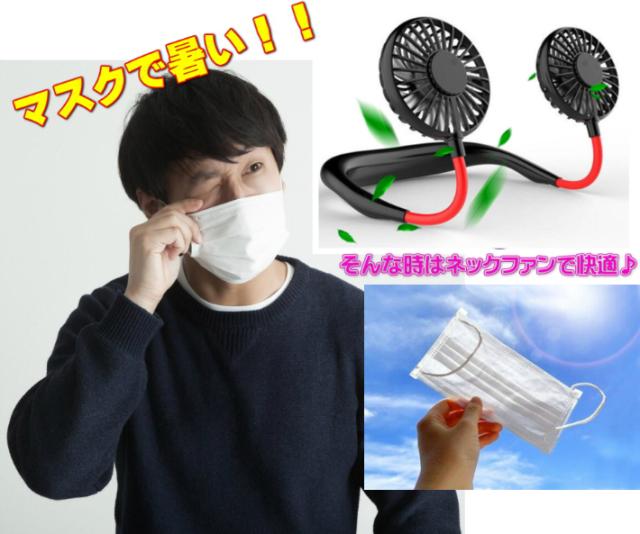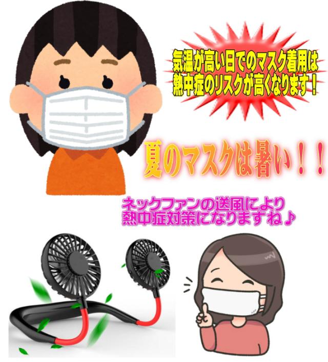 ネックファンで顔(マスク周り)に送風する事によって涼しく快適♪熱中症対策になります。