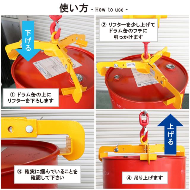 簡単取付け!ドラム缶の縦吊りに最適 ●ラム缶の縦吊りが簡単に行えるドラム吊り上げ金具です ●クレーンやホイスト等に連結し、ドラム缶の縁を引っかけて吊り上げます またフォークフックなどを使えば、フォークリフトで吊り上げる事もできます ●バランスのよい3本アーム構造で安定感抜群です ●ドラム缶を吊り上げた時の高さを最小限に抑える構造なので、 天井の低い場所での吊り上げ作業に最適です ●可動式フックで装着/着脱が素早く行えます ●軽量なので、持ち運びにも便利です ●アーム長さは2段階調整可能 200Lドラム(55ガロン)はもちろん、中小型缶(30ガロン)にも対応します ※ドラム缶のサイズと商品サイズを必ずご確認下さい ※ドラム缶は商品には含まれておりません ※フォークフックは別売りです ※オープンドラム缶、樹脂ドラム缶、蓋のないドラム缶には使用できません ※フックがドラム缶のフチ(チャイム)を確実に掴んでいることを確認し、 吊り上げをして下さい 品番:DHR-21 |