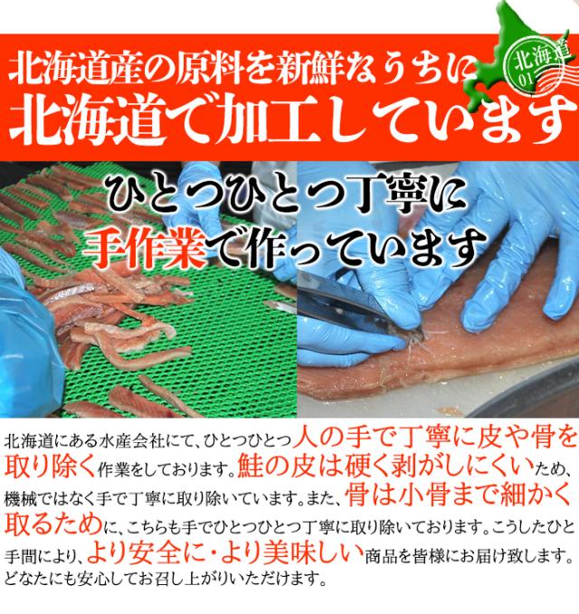 しております。鮭の皮は硬く剥がしにくいため、機械ではなく手で丁寧に取り除いています。
