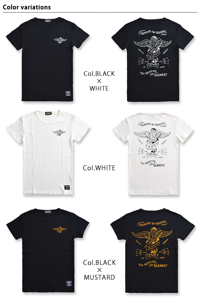 | 様々なジャンルで、アイコンとして不動の地位を築いている”スカル”というモチーフを、型にとらわれない自由な発想で、様々なデザインに落とし込んでいく。 既成概念に決して媚びない、新しいスカルの形を追求し続けるスカルワークスから「フライングホイールサーマル半袖Tシャツ(111562)」のご紹介です。 フライングホイールをプリントした、遊び心のある大人のためのTシャツが登場。 素材の特性も最大限に生かしたプリントも特徴的です。 バック中央には、ホイールに翼が生えたモチーフをプリント。 その下にはスカルがデザインされており、ブランドロゴが描かれたリボンが巻き付けられています。 「DEMAND THE GENUINE(本物を追及する)」と記された、スカルワークス拘りの1着です。 フロントはシンプルに、左胸のワンポイントのみ。 こちらにもバック同様に、ホイールと翼のモチーフがプリントされています。 左裾には、ブランドオリジナルの布タグを縫い付けました。 今回、ボディーにはサーマル生地を使用。 伸縮性に長けており、ぴったりとしたシルエットで着用して頂けます。 また、生地も柔らかく、肌触りも◎なので、汗ばむ季節にぴったりです♪ カラーは3色。それぞれのボディーカラーに合わせて、用いる色味にも変化を持たせており、単色で仕上げました。 ホワイトは水性プリントを使用し、ブラックにはそれぞれ抜染と着色抜染という特殊な技法を使用。 ブラック×ホワイトには、生地を染めた後に柄の形に色を抜く、抜染という技法を、 ブラック×マスタードには、抜染後、さらにそこに色を乗せる高度な加工方法を採用しています。 サーマルの凹凸にプリントが施されておりますので、独特の風合いが魅力的。 スカルワークス人気のタイトなシルエットを、存分にお楽しみ頂くことの出来る1着です。 | |||||||||||||||||||||||||