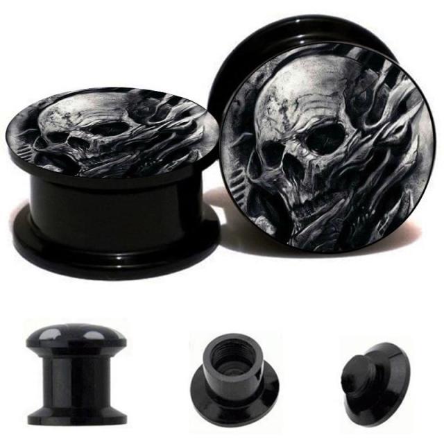 ダブルフレアの黒のアクリルプラグに不気味な髑髏(ドクロ)をデザインした不気味な ボディピアス。呪われそうな不気味ながい骨が存在感を発揮してくれるオススメのボディーピアス! 男の人からも女の人からも人気のブラックアクリルボディピアス。 ネジ式のダブルフレアなので、インサーションテーパーや拡張器がなくても装着も簡単なプラグです。メンズでもレディースでも使えるボディピアスはペアルックやプレゼントにも最適です。コスパにも注目!アクリル製なので金属アレルギー対応なのもうれしい。 両端が広がったダブルフレアタイプなのでキャッチの必要もない。トンネル型のようなおしゃれなホール系ボディピアス。