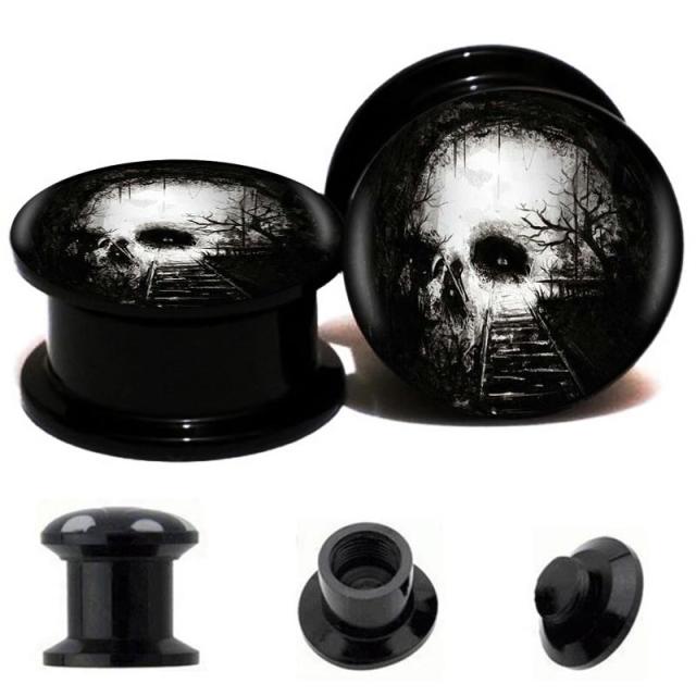 ダブルフレアの黒のアクリルプラグに死神と森のトンネルへ続く線路をデザインした不気味な ボディピアス。よ〜く見るとスカルに見えるだまし絵のような不気味な髑髏(ドクロ)ボディピアス。呪われそうな不気味ながい骨が存在感を発揮してくれるオススメのボディーピアス! 男の人からも女の人からも人気のブラックアクリルボディピアス。 ネジ式のダブルフレアなので、インサーションテーパーや拡張器がなくても装着も簡単なプラグです。メンズでもレディースでも使えるボディピアスはペアルックやプレゼントにも最適です。コスパにも注目!アクリル製なので金属アレルギー対応なのもうれしい。 両端が広がったダブルフレアタイプなのでキャッチの必要もない。トンネル型のようなおしゃれなホール系ボディピアス。