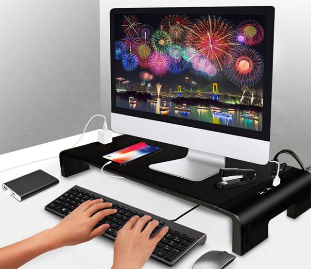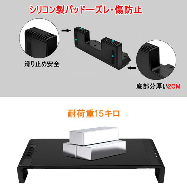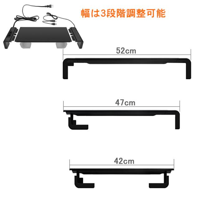 モニター台 モニタースタンド 幅42〜52cm 奥行20cm コンセント付き 机上台 4USBポート USBハブ付き ブラック 机上ラック