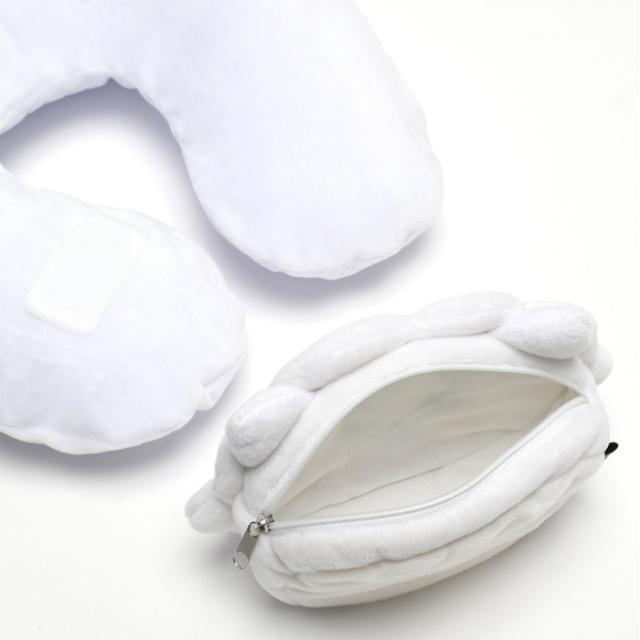 こちらは、親切で礼儀正しいアルカパのRJをモチーフにしたネックピロー。メインカラーのホワイトが清潔感もありつつブラックの糸を使用し刺繍で表現された鼻に加え両頬のピンクが可愛らしさもプラス。毛足が短く滑らかで肌触りも良く温もりのある素材を採用。中身は首後ろにジップが取り付けてあり、使用する際に自分で空気を入れて硬さを調整出来るようになっているのもポイント。普段はRJモチーフの付属のポーチに収納して持ち運べるようになっています。デスクワークや勉強の際のちょっとした休憩時や、乗り物での移動の際など様々なシーンで使えるのも魅力です。ポーチにはマジックテープを取り付けていて本体に取り付けることも可能。 お部屋のさりげないインテリア使い等から、パッケージも今回の取り組み限定デザインになっていてプレゼントとしてもお勧め。