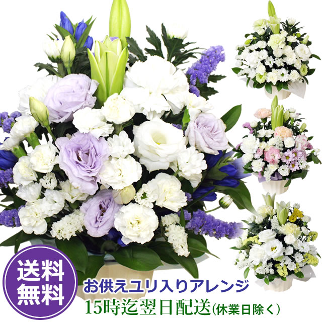 お供え花 ユリ入りアレンジ 送料無料 翌日配送 御供 お供え お悔やみ 花 生花 アレンジメント 仏花 供花 命日 喪中お見舞い 法事 法要 葬儀 お葬式 お通夜 命日 お盆 お彼岸