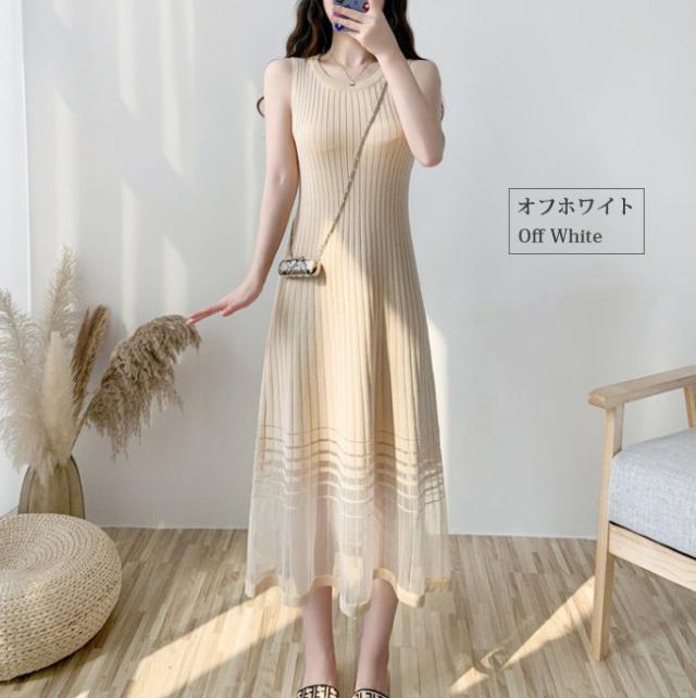 サマーニット ワンピース 裾シースルー 異素材切り替え ボーダー柄 リブニット ノースリーブ ロング aライン 春夏 レディース おしゃれ ストレッチ 薄手 涼しい 2022 新品 新作 40代 30代 20代 服 ロングワンピース