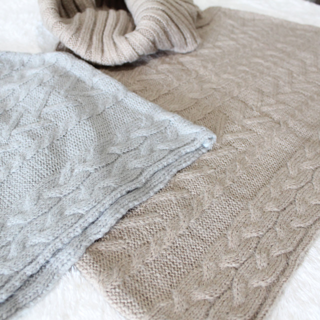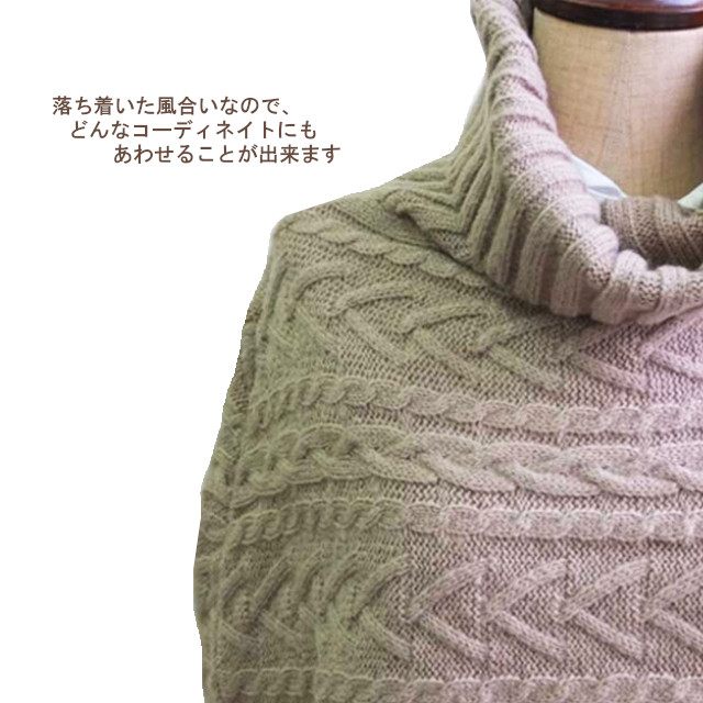 落ち着いた風合いなので、どんなコーディネイトにもあわせることが出来ます。 ケーブル編みのアイテムを着れるのは冬場ならでは・・見ているだけで温かさを感じます。 ニットは薄めで軽いので シンプルなニットや綿の白シャツに合わせれば 大人っぽく女性らしい印象になりますよ。