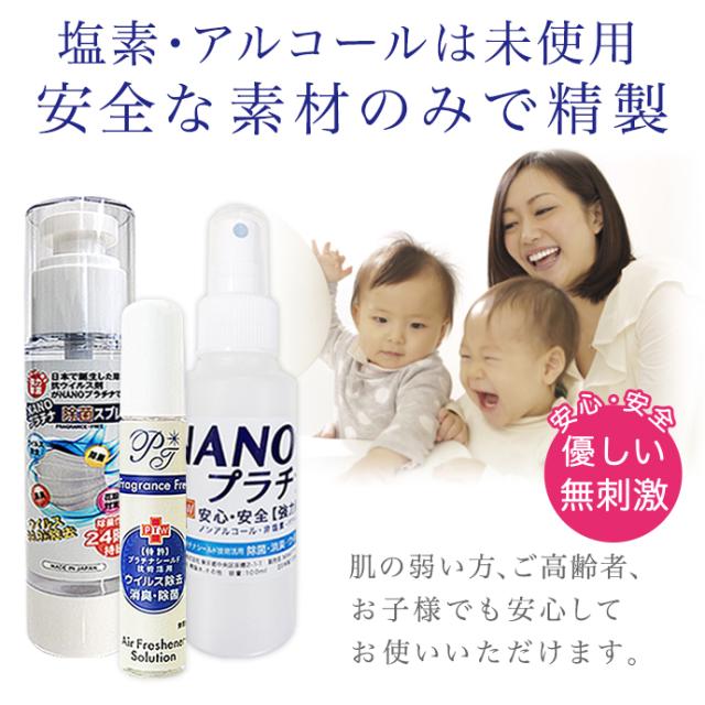 長時間除菌を可能にしたプラチナシールド固定化技術により、塩素やアルコールを使用せず、刺激性が無く優しいNANOプラチナの驚異的な除菌力で長時間の除菌・消臭効果を可能にしました。