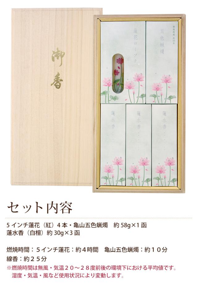 5インチ蓮花(紅)4本・亀山五色蝋燭 約58g×1函蓮水香(白檀)約30g×3函