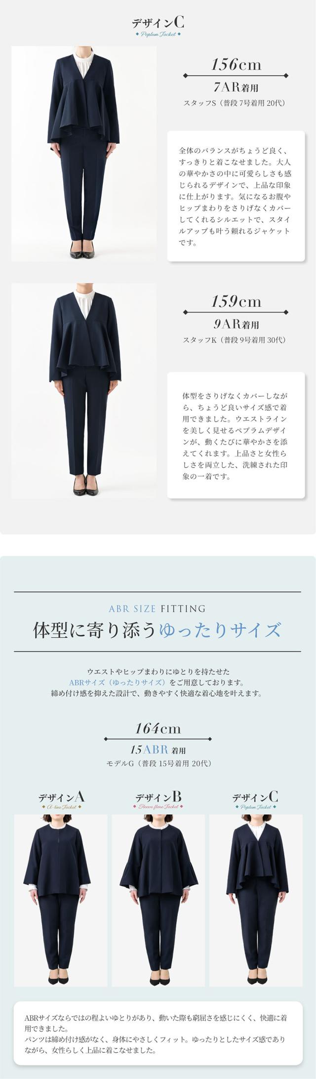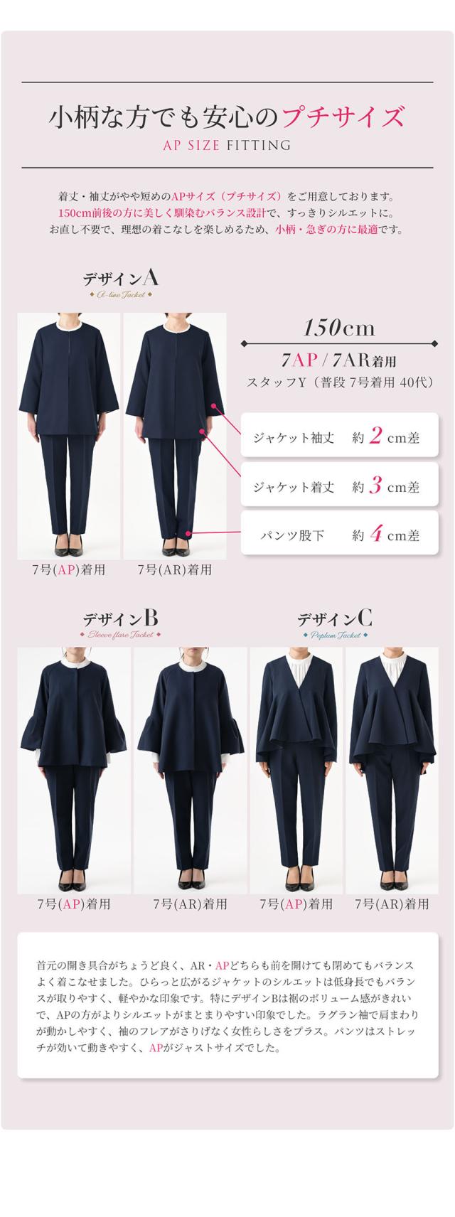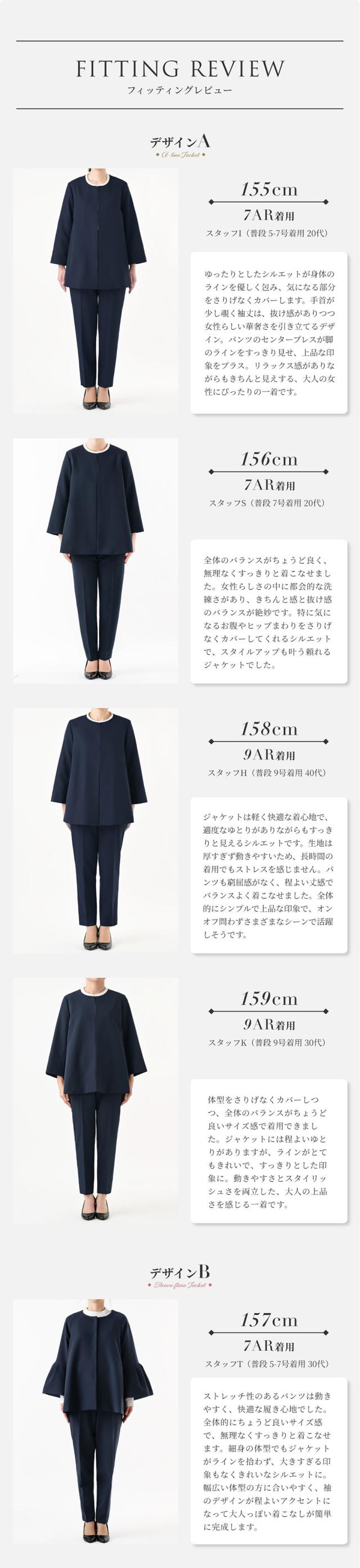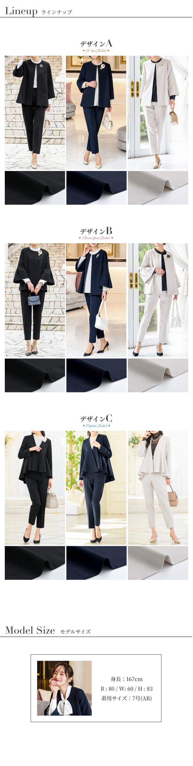 ジャケットは3タイプからお選びいただけ、どれも体型を自然にカバーしながら、美しいシルエットを演出します。