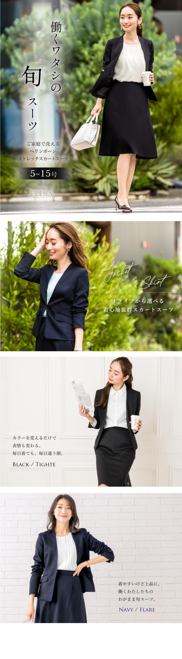 ELENA エレナ 即納 翌日配送 スーツ ビジネススーツ ビジカジ OL 通勤服 オフィスカジュアル キャリア スタイリッシュ フォーマル セットアップ 通勤 ビジネス オフィス カジュアル リクルート 大学生 新社会人 就職活動 就職 面接 ベーシック 服装 母親 母 ママ レディース 女性 ミモレ丈 長め丈 春夏 秋冬 20代 30代 40代 大人 上品 こなれ スカートスーツ スカート ジャケット テーラードジャケット カラーレスジャケット 長袖 半裏 半裏地 上下セット 2点セット 美ライン 体型カバー 細見え ストレッチ 洗える ウオッシャブル 洗濯 7号 9号 11号 13号 15号 S M L LL 2L XL LLL 3L XX