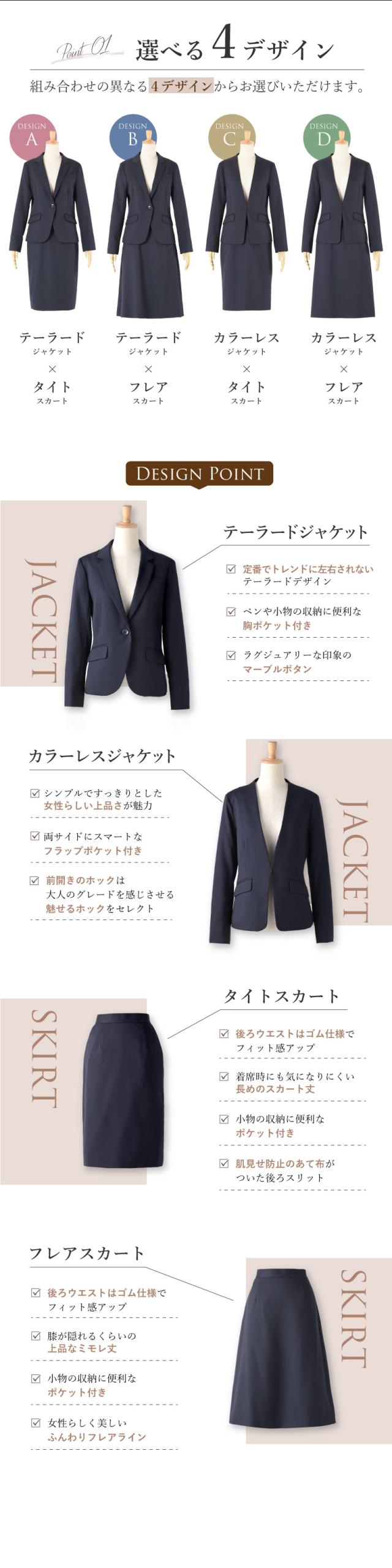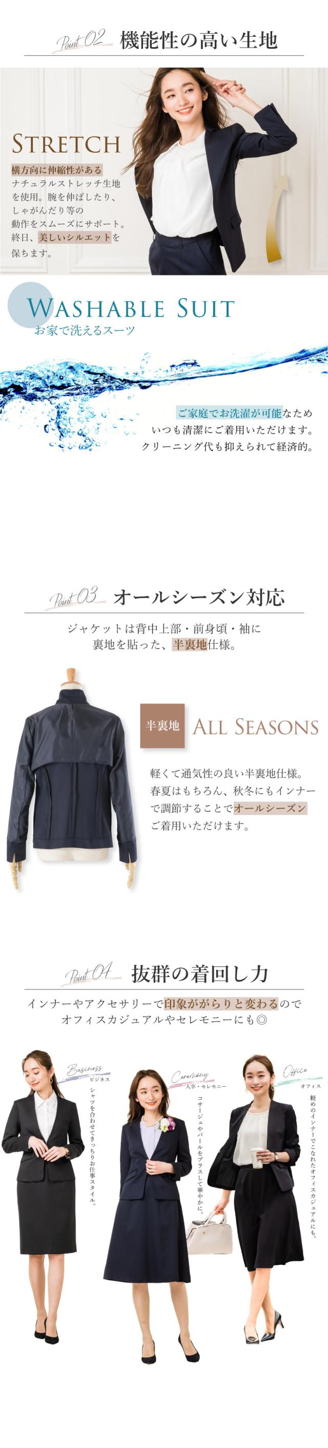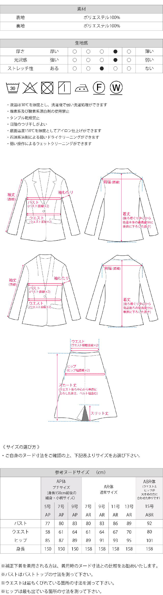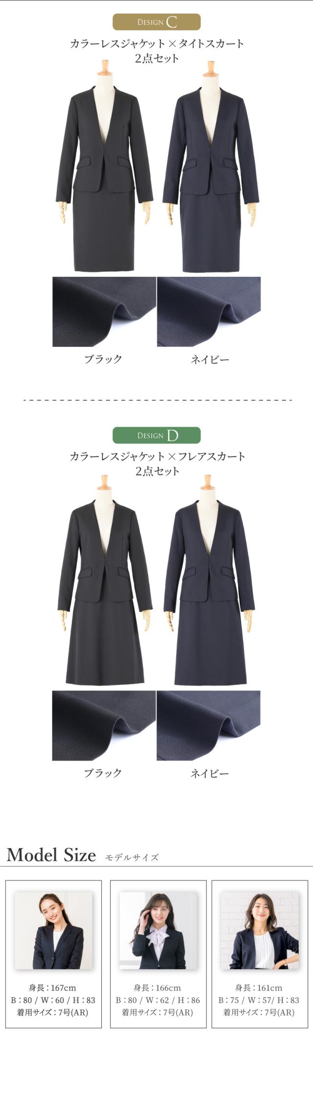 | ご家庭で洗える!フォーマル&キャリアスカートスーツ。 ジャケットの形は、テーラードとカラーレスの2タイプがございます。 さらに、スカートはベーシックなタイトと女性らしいフレアの2種類ご用意しました。 計4パターンからお好みのデザインをお選びいただけます。 表地は、上品な印象で高級スーツに使われるヘリンボーン生地を使用したスカートスーツです。 動きを邪魔しない、耐久性に優れた柔らかい素材。 ナチュラルストレッチ素材を使用しています。 またご家庭で洗えるのでいつでも清潔に着用できます。 家計にも優しいご家庭で洗えるスカートスーツ! 汗をかいてもすぐに洗えるからヘビロテしたいスーツです。 美しいシルエットと快適な着心地で、クールなセレモニー&キャリアスタイルが決まります。 様々なシーンに対応可能で、スタイルアップを実現するスカートスーツです。 | |