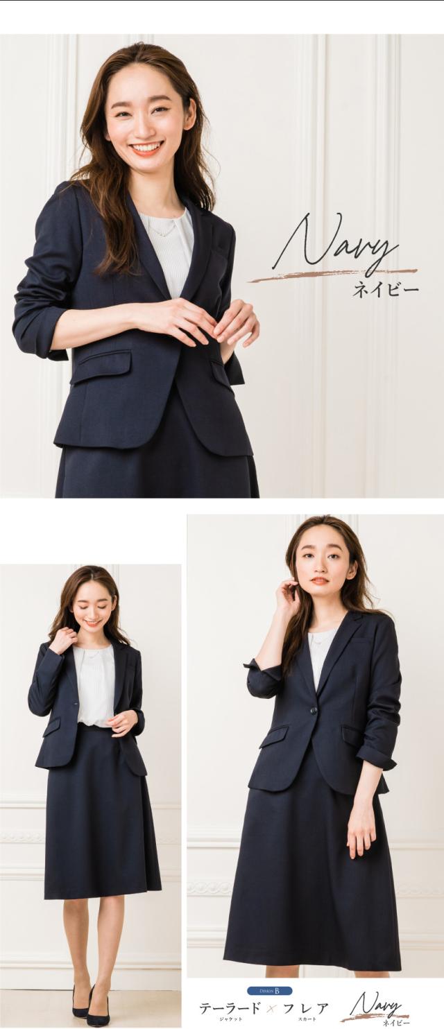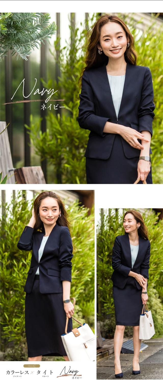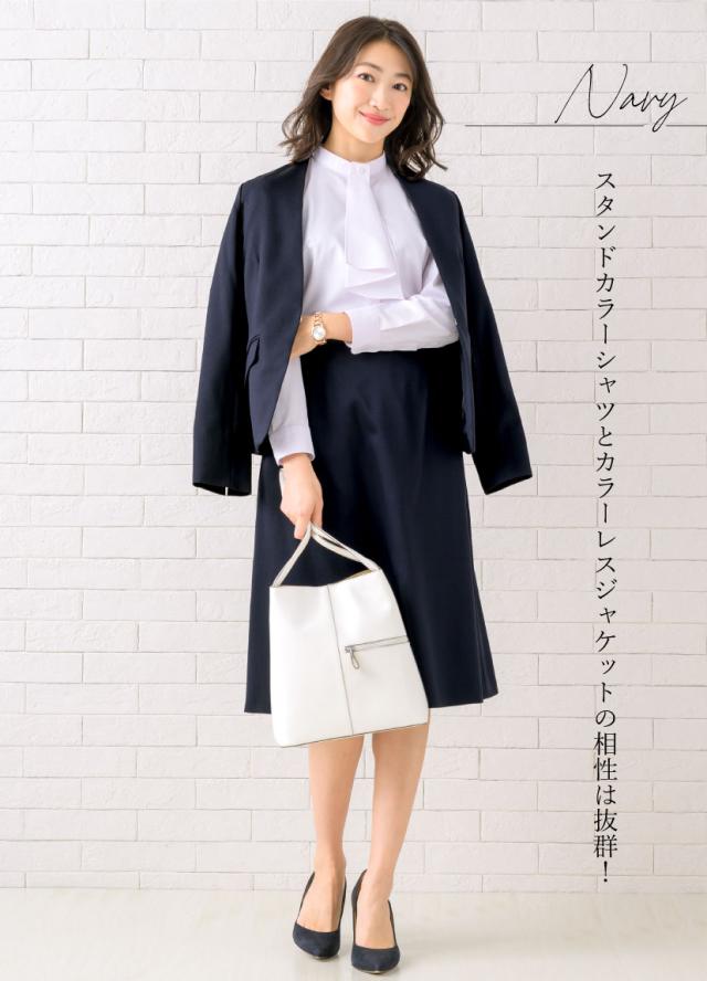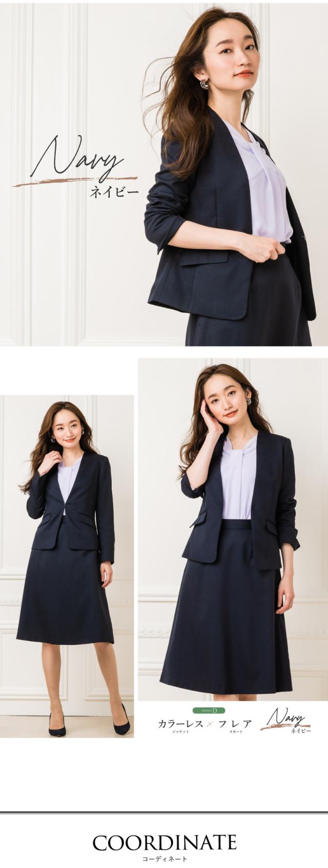 スーツ レディース ストレッチ 長袖 洗える テーラード カラーレス スカート フレア タイト 半裏地 オフィス ビジネス 通勤 OL おしゃれ 黒 ネイビー 夏 大きいサイズ 小さいサイズ