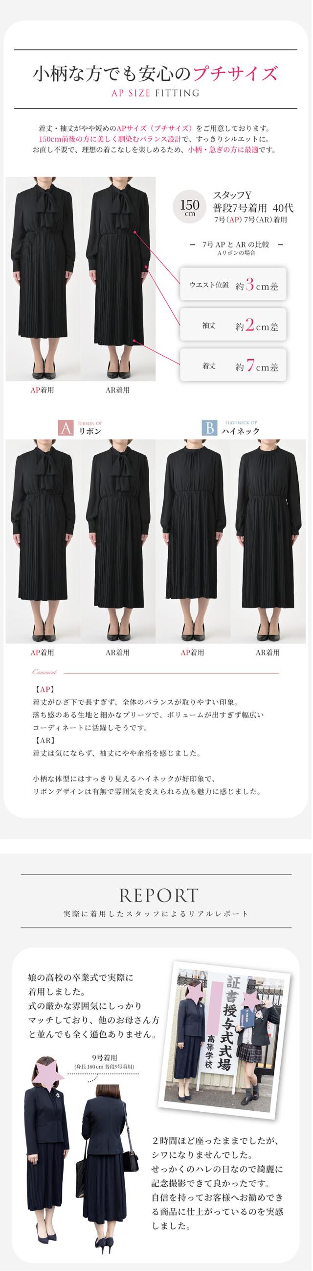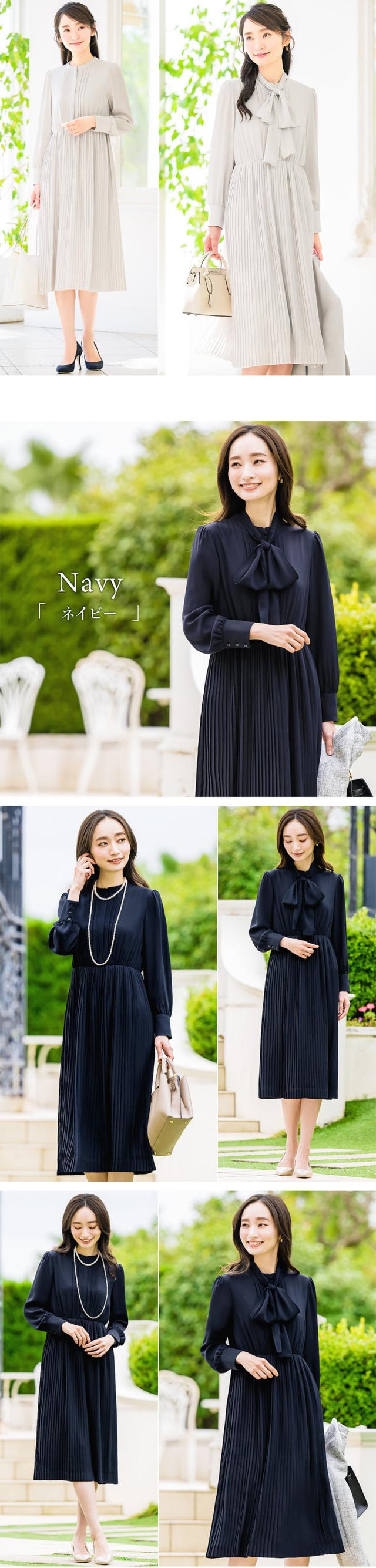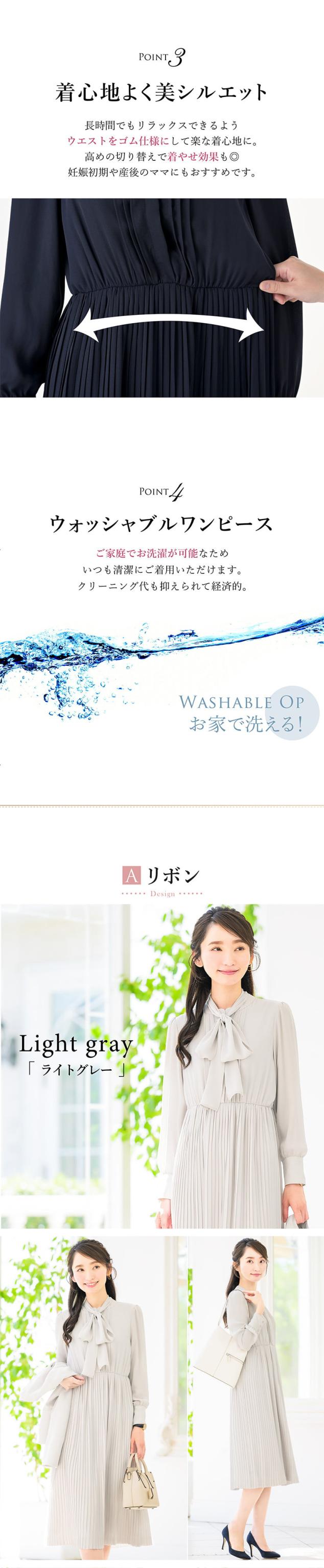 | 着回しを楽しめるきれいめワンピースが新登場! 入学式のお祝い事が重なるシーズンは何かと物入り… 「そのとき用」は勿体ないので、足したり引いたりしてたくさん着回せるワンピースをご用意しました♪ 【選べるデザイン】 ワンピースはそれぞれ印象の違う2デザイン。 お色はライトグレー、ネイビー、ブラックからお選びいただけます。 Aリボン:リボンの取り外しが可能な2wayデザイン。一着で2つの顔を楽しめます。 また、前開きのため着脱が簡単に。授乳期のママにもおすすめです♪ Bハイネック:首元にギャザーが入っており、シンプルながらも上品な一着。 袖にパールボタンが付いており、細部にも女性らしさを感じるデザインです。 どちらのデザインもスカート部分や生地は共通で、動いた時の揺れ感が上品な軽い素材を使用。 華やかな印象のプリーツデザインが女性らしさを後押しします。 少し長めのレングスで座った時も膝が出ず好印象◎ 【抜群の着回し力】 入学式や卒業式といったセレモニーはもちろん、お子様の学校行事や通勤、オフィス・デイリー・ディナーにも。 どんなシーンにもマッチして1着あると便利なきれいめワンピースです。 【着心地よく美シルエット】 長時間でもリラックスできるよう、ウエストをゴム仕様にして楽な着心地に。 高めの切り替えなため着やせ効果も期待できます◎ 妊娠初期や産後のママにもおすすめ♪ 【ウォッシャブルワンピース】 ご家庭で手軽に洗えるためいつも清潔にご着用いただけます。 クリーニング代も抑えられて経済的。 【ジャケットセットもご用意】 肌寒い季節や、よりきちんと感を求められるシーンにはジャケットが必須。 コーディネートの幅がさらに広がるジャケットセットもご用意しております。 是非ご利用くださいませ。 フォーマルシーンのみならず、どんなシーンにも活躍する優れもの。 ワードローブに一着は欲しいきれいめワンピースです。 | |