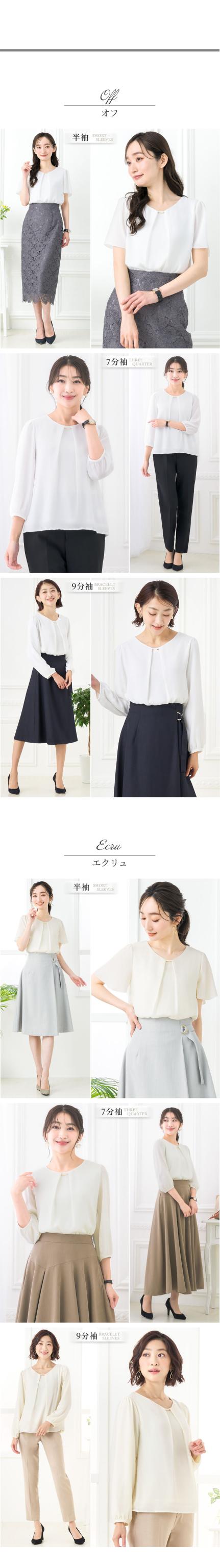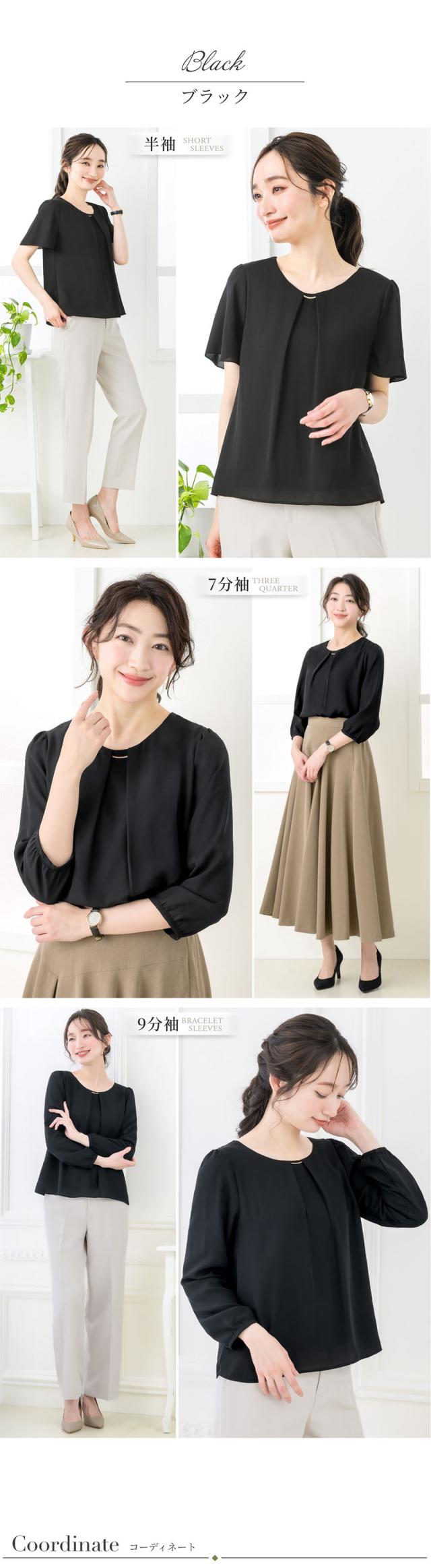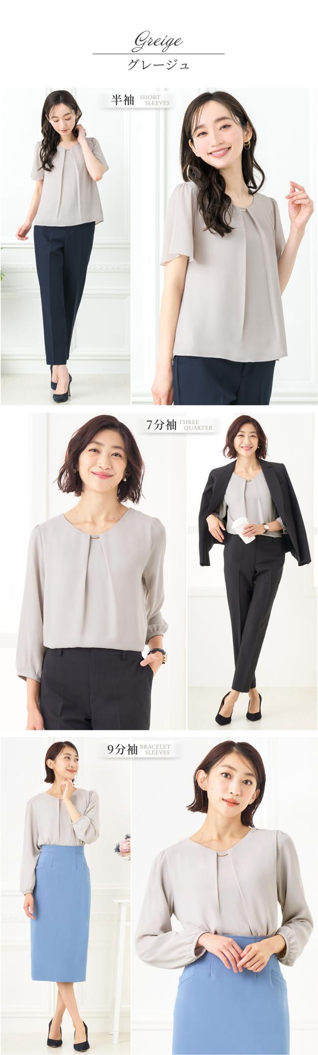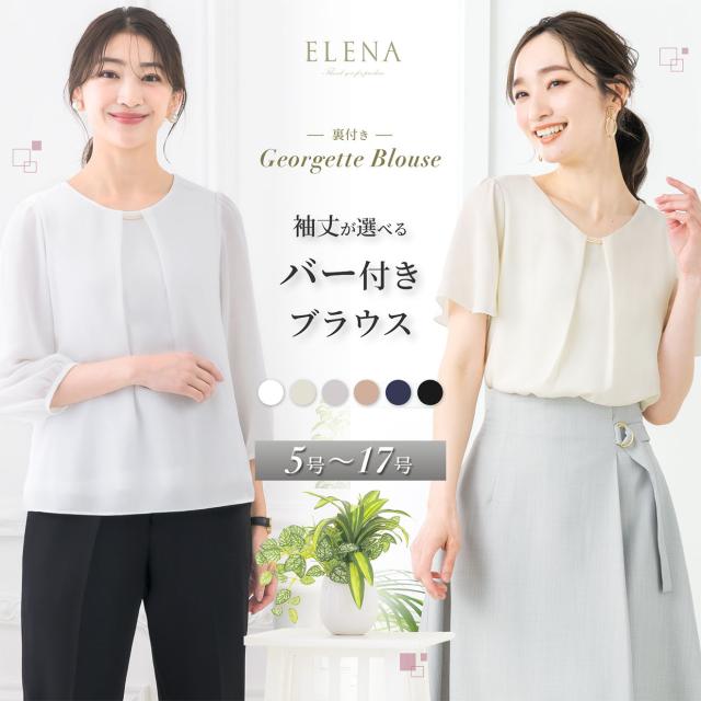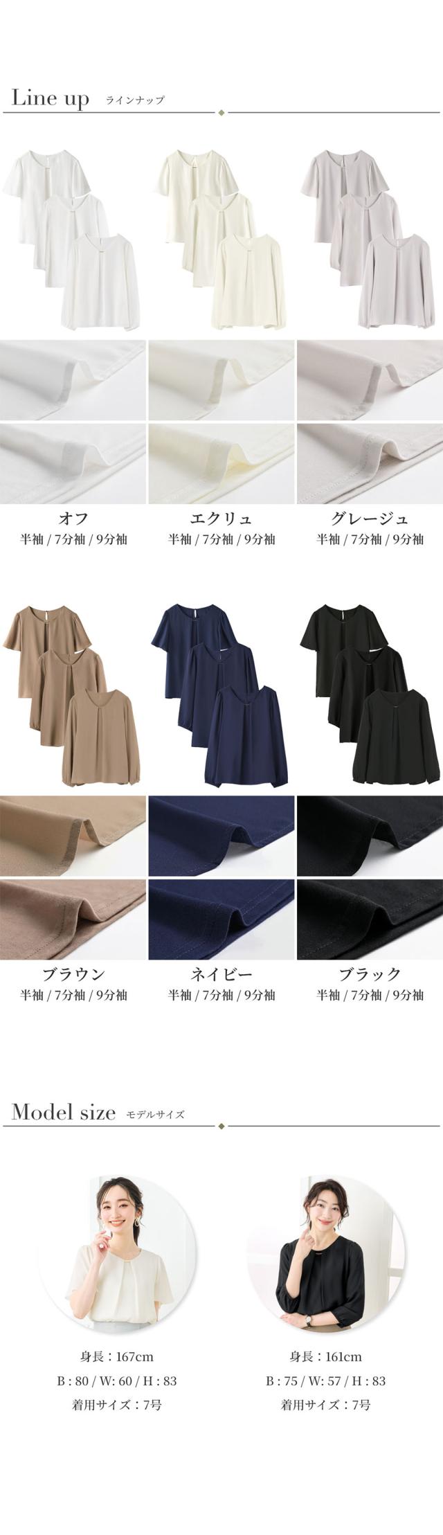 上品なとろみと落ち感が魅力のジョーゼット素材を使用した、きちんと感のあるブラウス。 首元のバーがさりげないアクセントとなり、シンプルながらも洗練された印象に仕上がります。 オフィスからフォーマルまで幅広く着まわせる、日常に自然と馴染む一枚です。 【袖丈が選べる】 半袖・7分袖・9分袖の3タイプをご用意。 季節やシーンに合わせて選びやすく、ロングシーズン活躍します。 ほどよくゆとりのある設計で、すっきりとした見た目に整えました。 【上品なバー付きデザイン】 緩やかなネックラインにあしらったゴールドバーが、顔まわりをすっきりと見せながら女性らしさを引き立てます。 アクセサリーなしでも着映えする、シンプルで洗練されたデザインです。 【豊富なカラーバリエーション】 オフ・エクリュ・グレージュ・ブラウン・ネイビー・ブラックの全6色展開。 ベーシックからニュアンスカラーまで揃い、スタイリングに合わせてお選びいただけます。 【着脱しやすい設計】 背中部分は涙あき仕様で、着脱もスムーズ。 見た目の美しさと使いやすさに配慮した仕上がりです。 【上品なジョーゼット素材】 程よいシボ感のあるジョーゼット生地を使用。 軽やかでさらりとした肌触りと、自然な落ち感が魅力です。 動きに合わせてやわらかく揺れるドレープが、品のある印象を添えます。 【デイリーからオフィスまで活躍】 一枚着としてはもちろん、ジャケットのインナーとしてもバランスよく着用可能。 きれいめスタイルにすっと馴染む、大人のためのブラウスです。 |