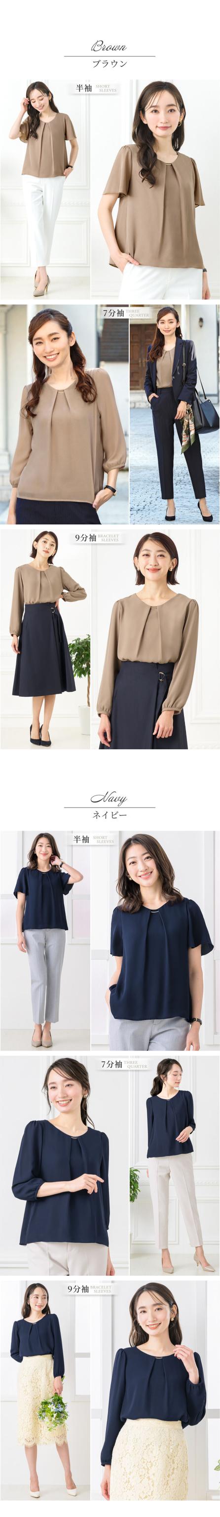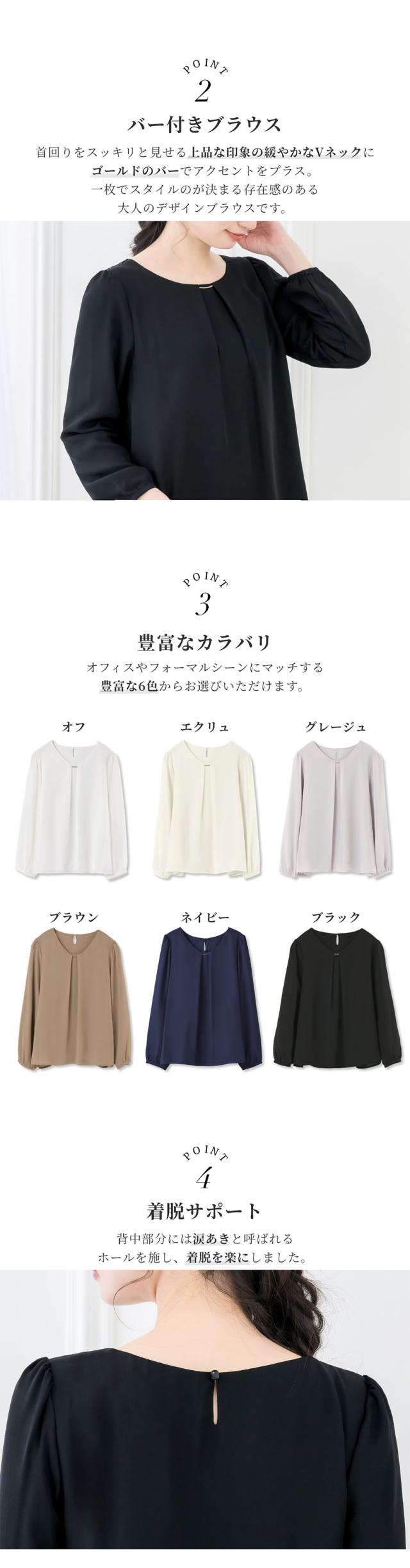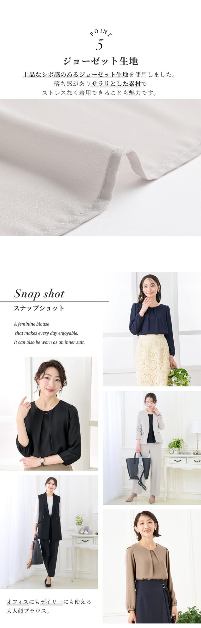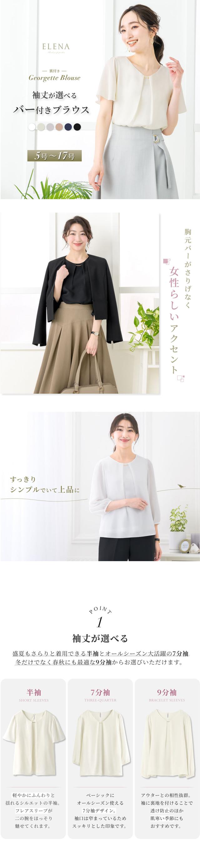 上品なとろみと落ち感が魅力のジョーゼット素材を使用した、きちんと感のあるブラウス。 首元のバーがさりげないアクセントとなり、シンプルながらも洗練された印象に仕上がります。 オフィスからフォーマルまで幅広く着まわせる、日常に自然と馴染む一枚です。 【袖丈が選べる】 半袖・7分袖・9分袖の3タイプをご用意。 季節やシーンに合わせて選びやすく、ロングシーズン活躍します。 ほどよくゆとりのある設計で、すっきりとした見た目に整えました。 【上品なバー付きデザイン】 緩やかなネックラインにあしらったゴールドバーが、顔まわりをすっきりと見せながら女性らしさを引き立てます。 アクセサリーなしでも着映えする、シンプルで洗練されたデザインです。 【豊富なカラーバリエーション】 オフ・エクリュ・グレージュ・ブラウン・ネイビー・ブラックの全6色展開。 ベーシックからニュアンスカラーまで揃い、スタイリングに合わせてお選びいただけます。 【着脱しやすい設計】 背中部分は涙あき仕様で、着脱もスムーズ。 見た目の美しさと使いやすさに配慮した仕上がりです。 【上品なジョーゼット素材】 程よいシボ感のあるジョーゼット生地を使用。 軽やかでさらりとした肌触りと、自然な落ち感が魅力です。 動きに合わせてやわらかく揺れるドレープが、品のある印象を添えます。 【デイリーからオフィスまで活躍】 一枚着としてはもちろん、ジャケットのインナーとしてもバランスよく着用可能。 きれいめスタイルにすっと馴染む、大人のためのブラウスです。 |