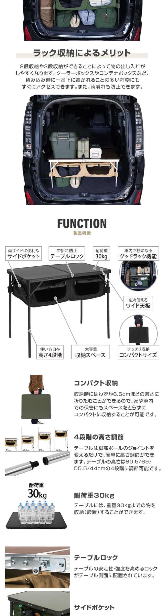 適当な高さに天板を調節して車の荷室に入れることで、テーブルを棚として使うことができます。テーブルの収納部分を使えば3段、取り外せば2段の収納が可能です。
