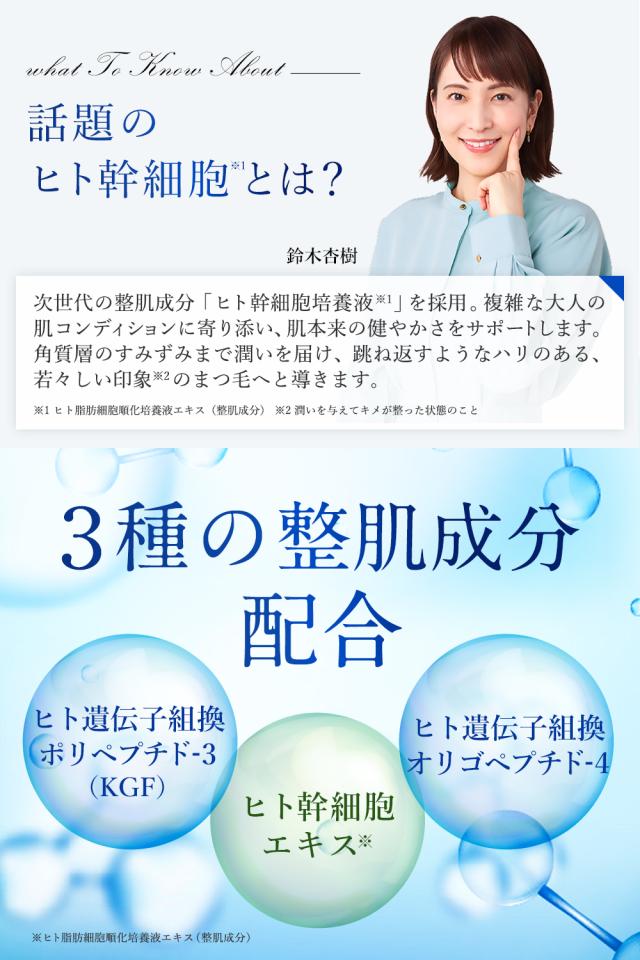 【成分】水、BG、グリセリン、ペンチレングリコール、ヒト脂肪細胞順化培養液エキス、(クエン酸/乳酸/リノール酸/オレイン酸)グリセリル、オリーブ果実油、ポリソルベート60、3-0-エチルアスコルビン酸、ヒアルロン酸Na、加水分解ヒアルロン酸、プラセンタエキス、ダイズステロール、セラミドNG、セラミドNP、セラミドAP、ビオチノイルトリヘプチド-1、パンテノール、セイヨウアカマツ球果エキス、チャ葉エキス、ピロリジニルジアミノピリミジンオキシド、アセチルテトラペプチド-3、アカツメクサ花エキス、デキストラン、ヒト遺伝子組換ポリヘプチド-3、ヒト遺伝子組換ポリヘプチド-4、トリペプチド-1銅、レシチン、水添レシチン、オレアノール酸、アピゲニン、PEG-40水添ヒマシ油、PPG-26ブテス-26、サッカロミセスセレビシアエエキス、乳酸桿菌/ワサビ根発酵エキス、グリチルリチン酸2K、クエン酸、クエン酸Na、リン酸Na、フェノキシエタノール