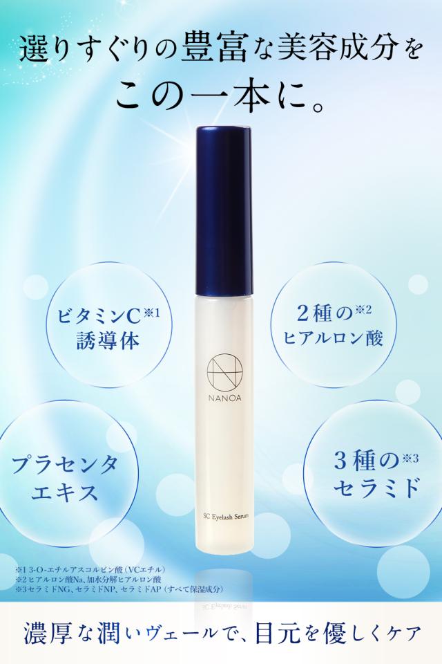 ◆実感力に徹底的にこだわり、ワイドラッシュ、リデンシル、ピディオキシジル、キャピキシル、プロキャピルという5大高級まつ毛ケア成分を全て配合。またビタミンC誘導体、2種のヒアルロン酸、プラセンタ、3種のセラミドを配合し、NANOAは圧倒的保湿力にこだわりました。