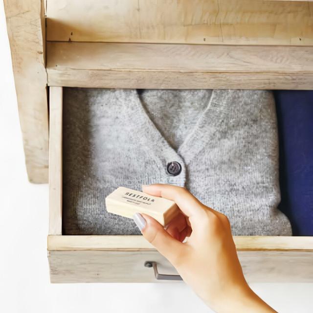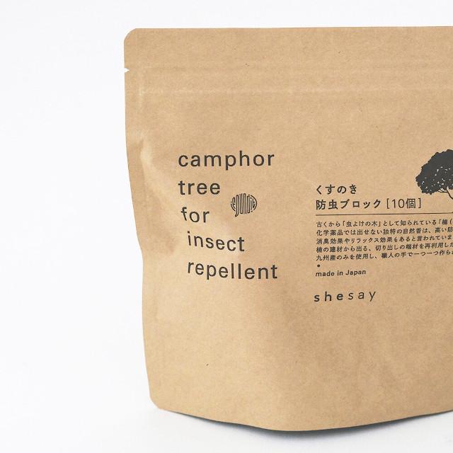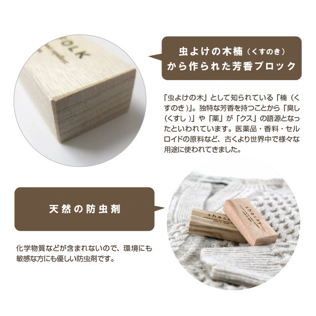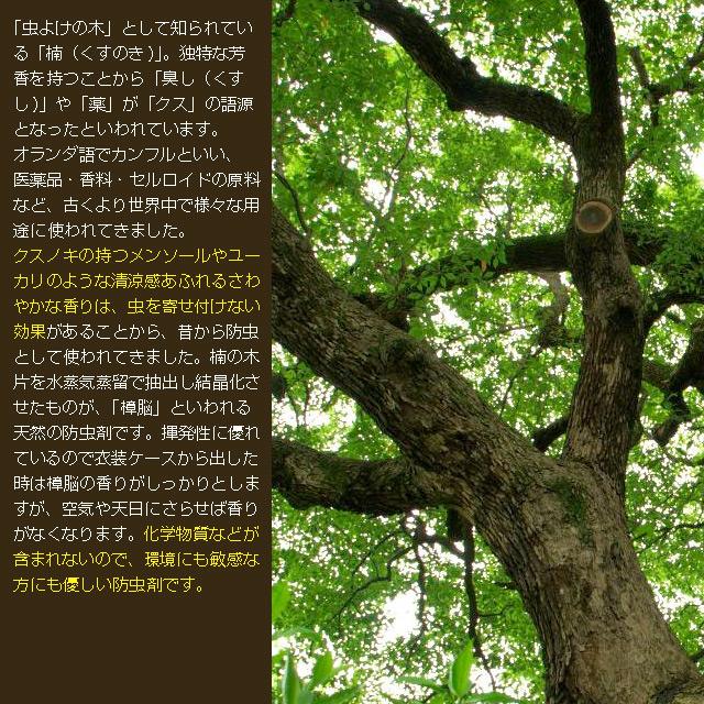 独特な芳香を持つことから「臭し(くすし)」や「薬」が「クス」の語源となったといわれています。オランダ語でカンフルといい、医薬品・香料・セルロイドの原料など、古くより世界中で様々な用途に使われてきました。 クスノキの持つメンソールやユーカリのような清涼感あふれるさわやかな香りは、虫を寄せ付けない効果があることから、昔から防虫として使われてきました。楠の木片を水蒸気蒸留で抽出し結晶化させたものが、「樟脳」といわれる天然の防虫剤です。揮発性に優れているので衣装ケースから出した時は樟脳の香りがしっかりとしますが、空気や天日にさらせば香りがなくなります。化学物質などが含まれないので、環境にも敏感な方にも優しい防虫剤です。 かつては専売品として国益の一役を担うまでの産業だった天然樟脳ですが、安価な合成防虫剤の普及や需要の減少から、現在生産しているのは数社のみになっている大変貴重なものです。